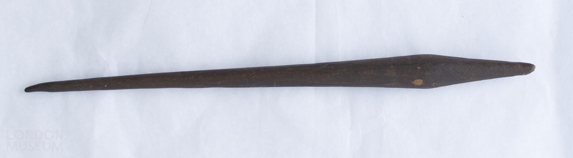 Wooden spindle, complete except for small portion of one end missing. Simply carved, straight with an off-centre bulge. Ends tapered to point.