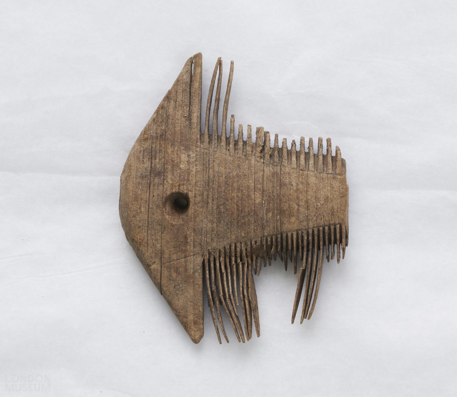 Fragile fragment of comb. Double sided with coarse teeth on one side and fine teeth on other side. Hole through centre of comb. Curved end of comb is perforated. Many teeth broken or missing.