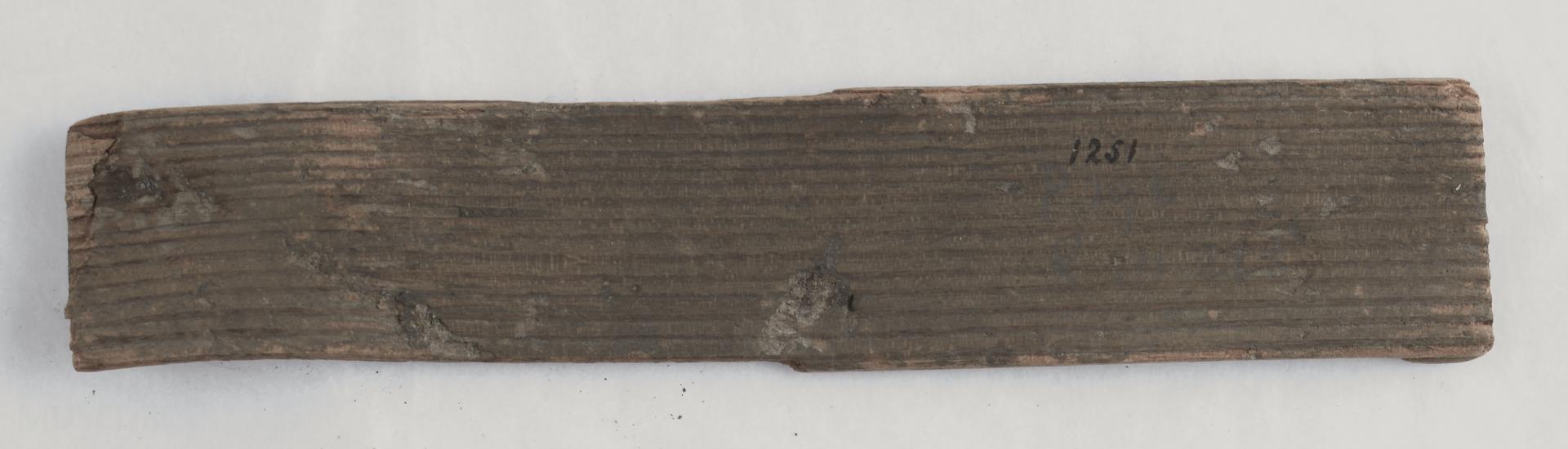 Wooden writing tablet fragment. Prominent border at one end for holding wax, other end slightly warped. Narrow linear incisions on both sides.