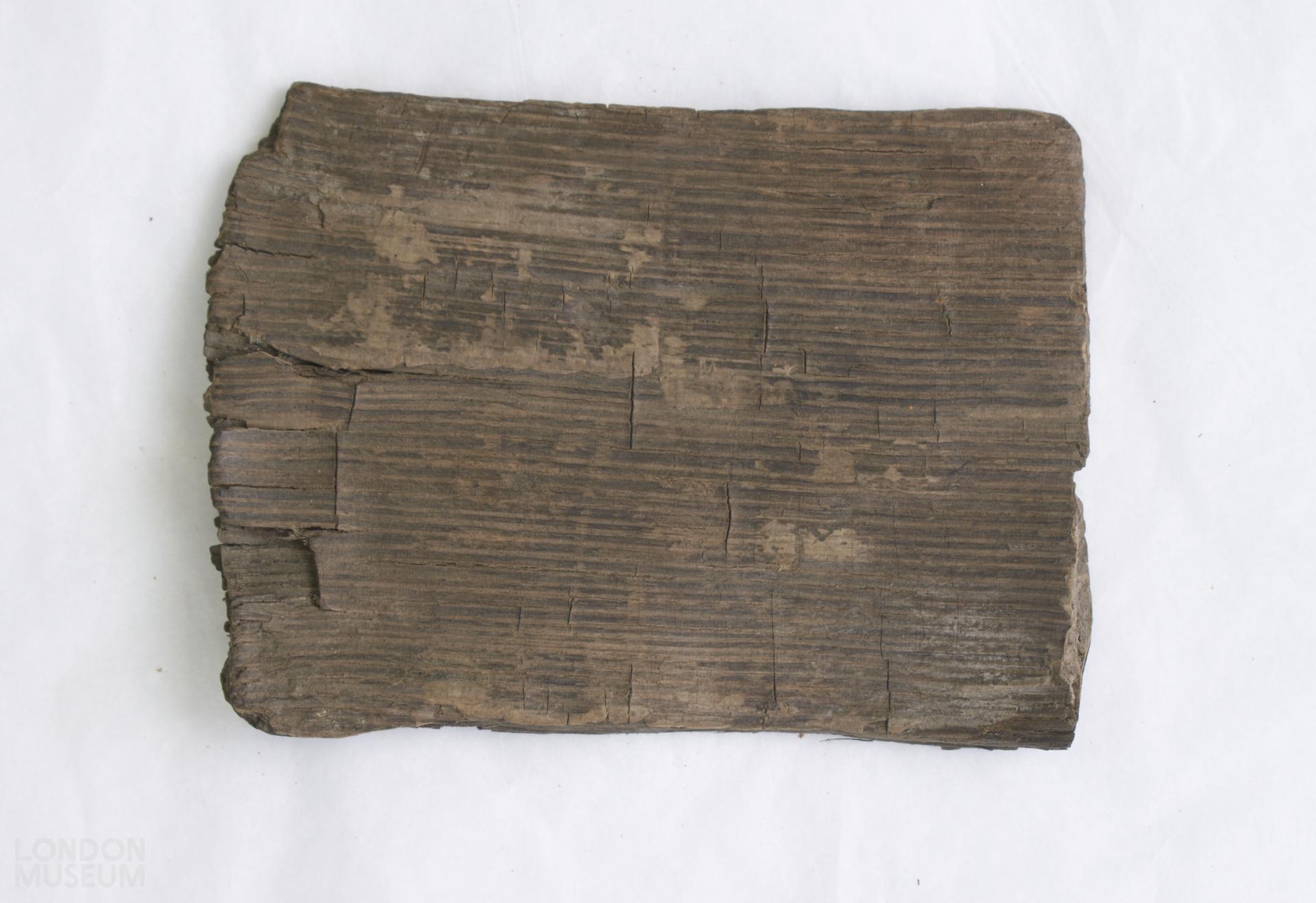 Wooden writing tablet fragment, poor condition. Linear incisions vaguely visible on both sides. Wood is splitting at either end.