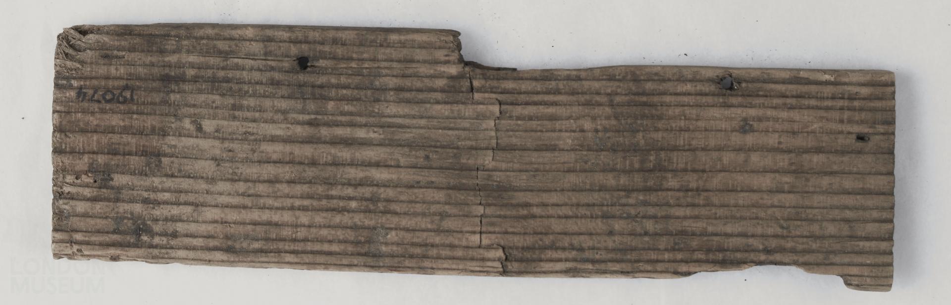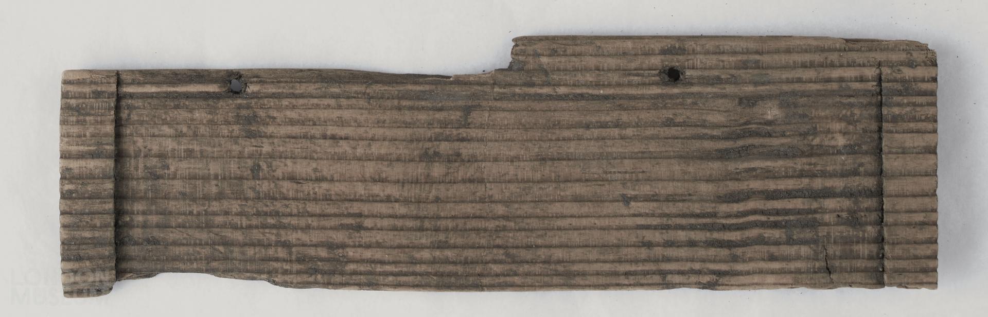 Wooden writing tablet fragment, edge of block and border raised on three sides. Longest edge pierced by 2 small holes for binding. Linear incisions both sides. Condition: cracking in the wood in the centre.
