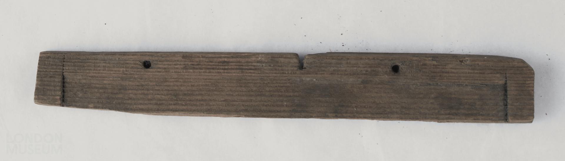 Wooden writing tablet fragment. Raised border on three edges of one side. Longest side pierced by 2 small holes for binding, and central notch carved. Linear incisions both sides.