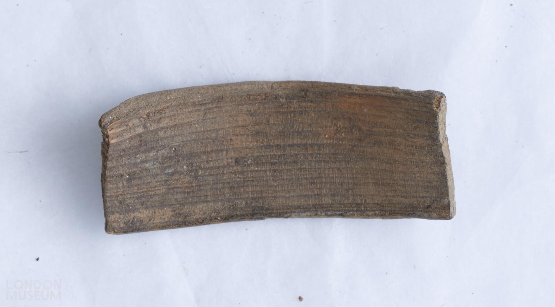 Warped wooden fragment from a writing tablet. Raised border on one edge of one side for wax. Linear incisions both sides.