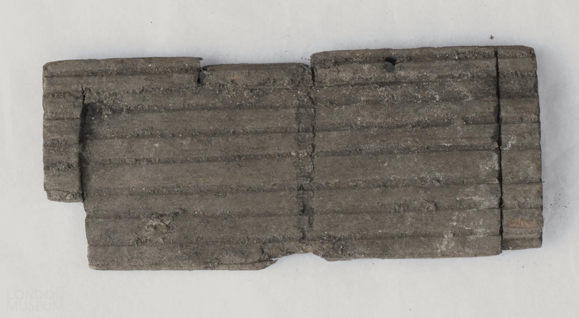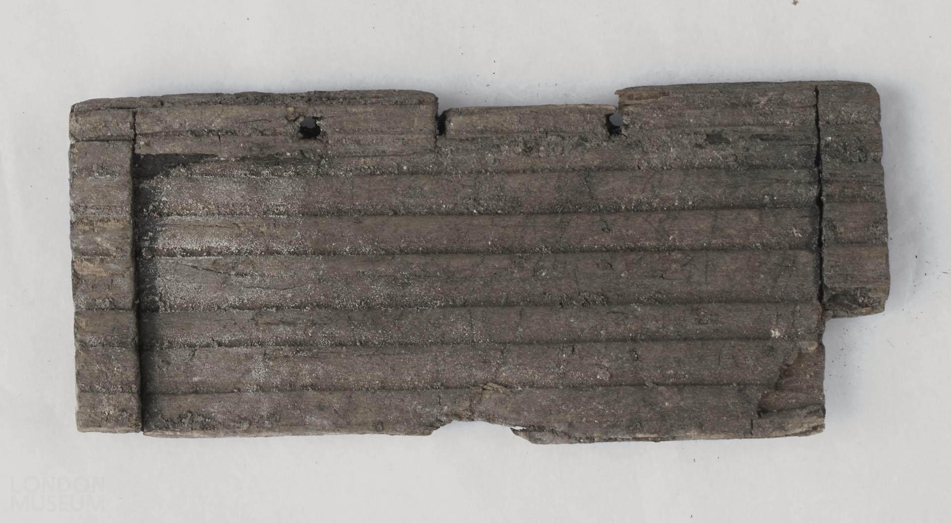 Wooden writing tablet fragment. Linear incisions across, with dividing line down centre and a border surround both sides. 2 small perforations at top.
