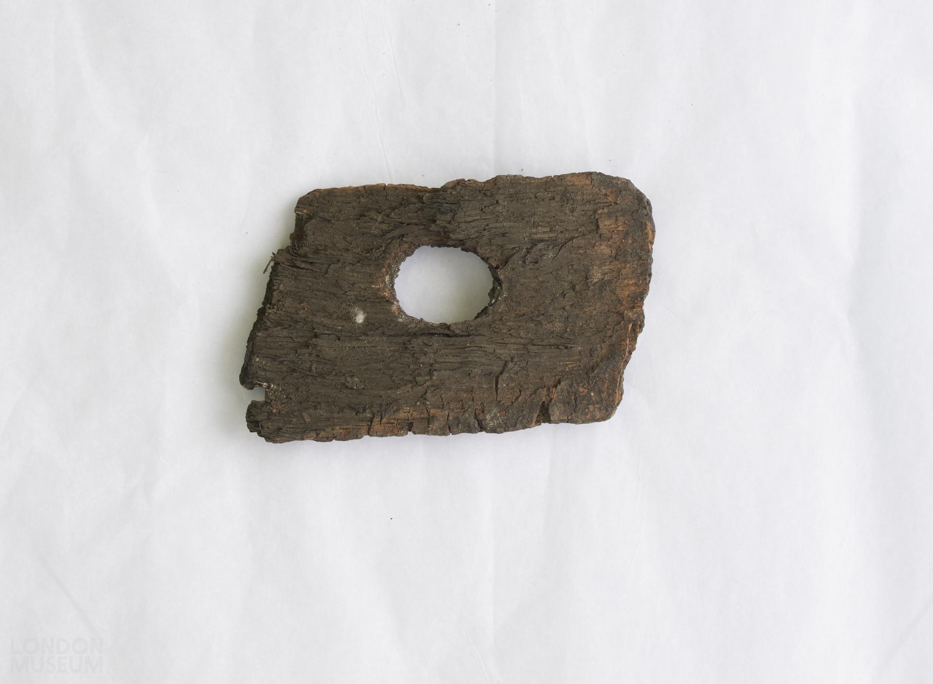 Wooden object with perforation through the centre. Handwritten label reads 'London Wall, Roman, Layer P, 1901'.