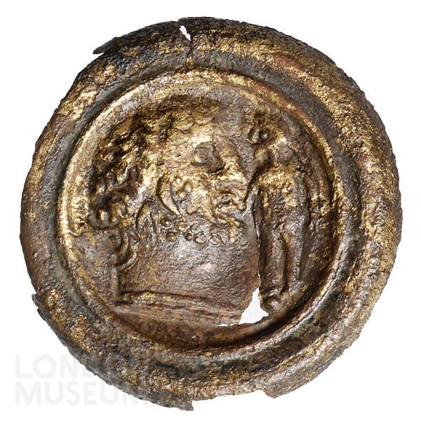 A copper alloy embossed portrait stud with the portrait head confronting a small figure. The main head, with embossed hair detail, is bearded and faces right, the smaller figure is standing left. The edges are turned down and the decorated area is surrounded by a raised rim. Only a stub of the square-sectioned shank survives.