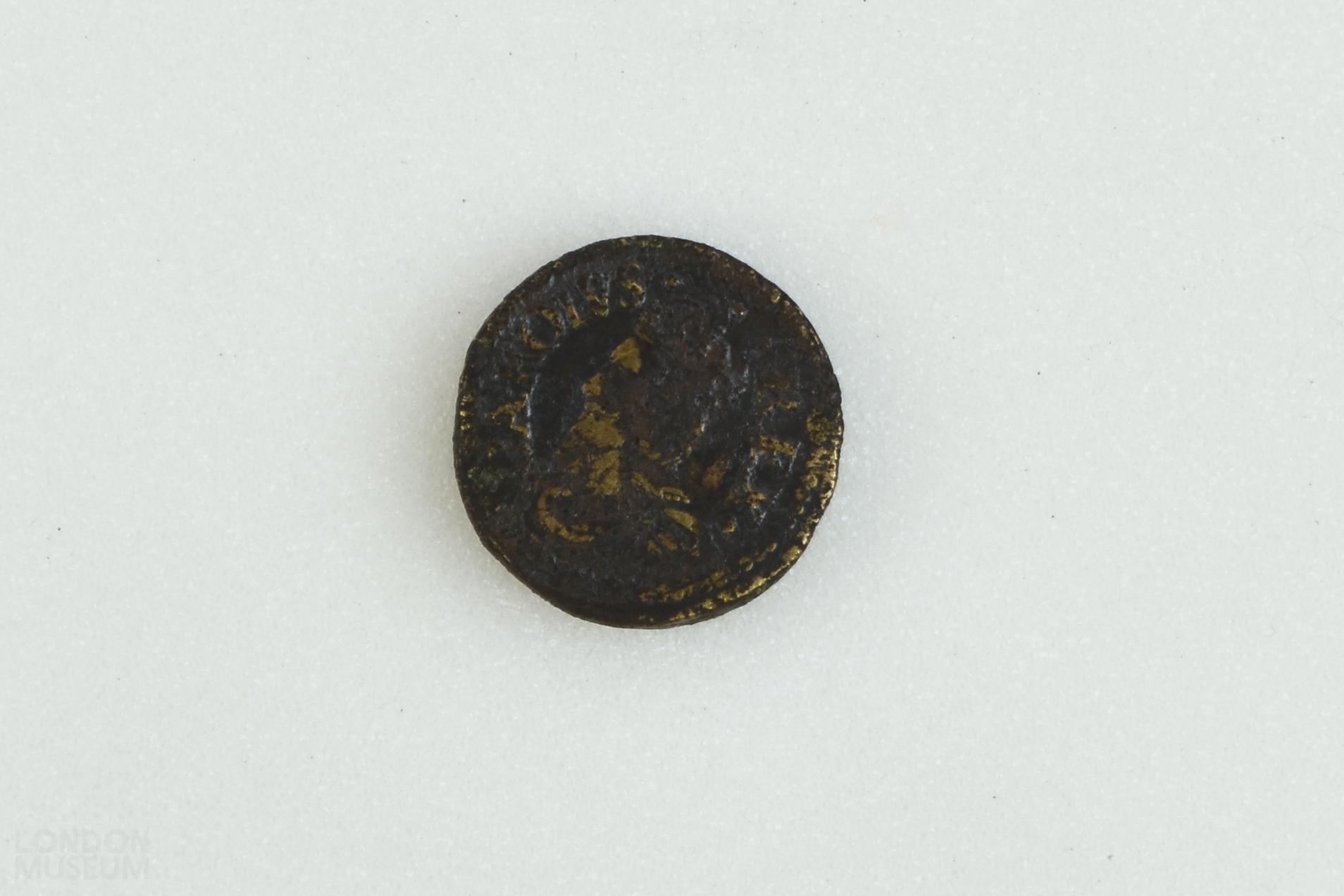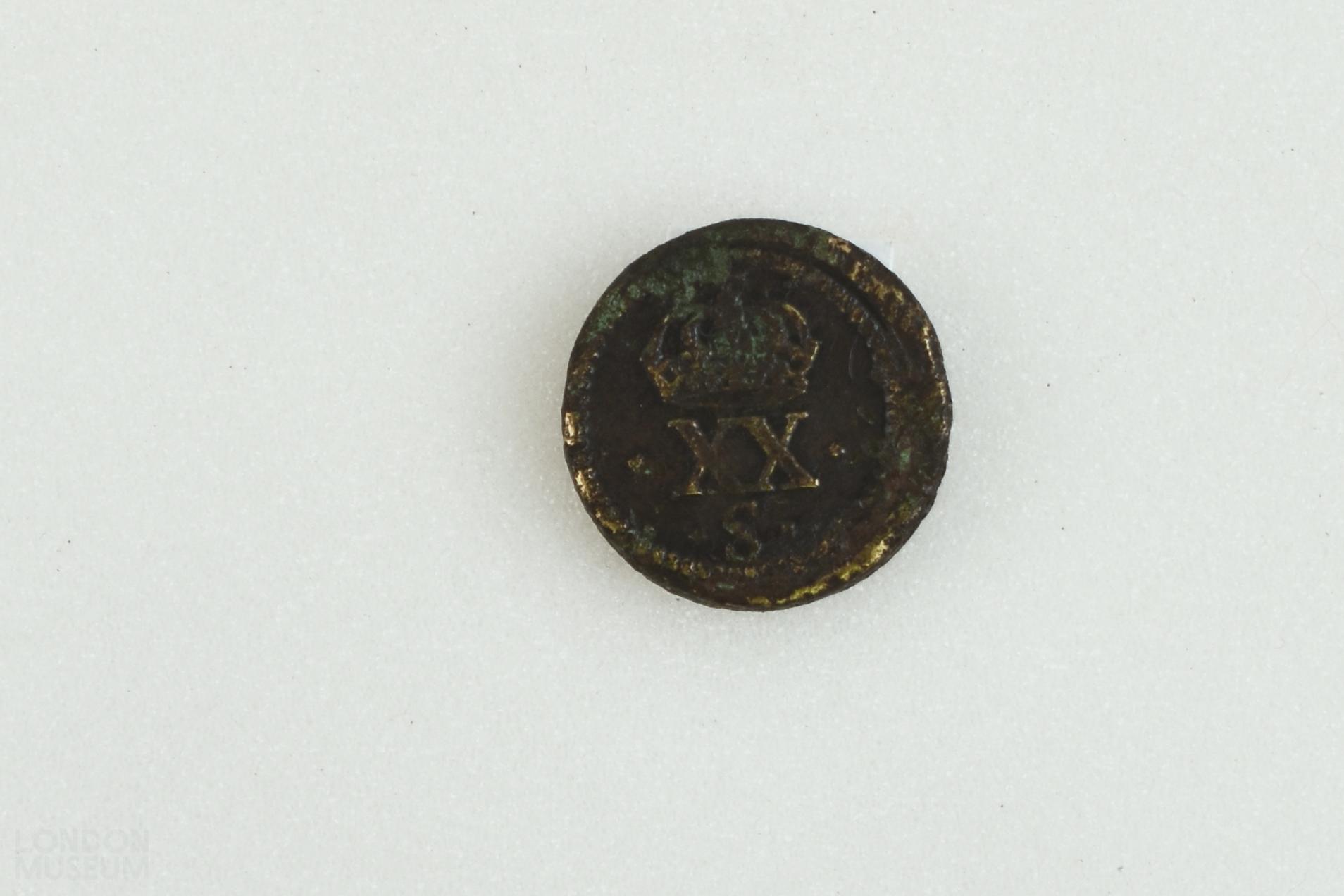 Circular coin weight, for half guinea. On the obverse, there is a side portrait with an indistinct legend. On the reverse, there is a crown above 'XXs'