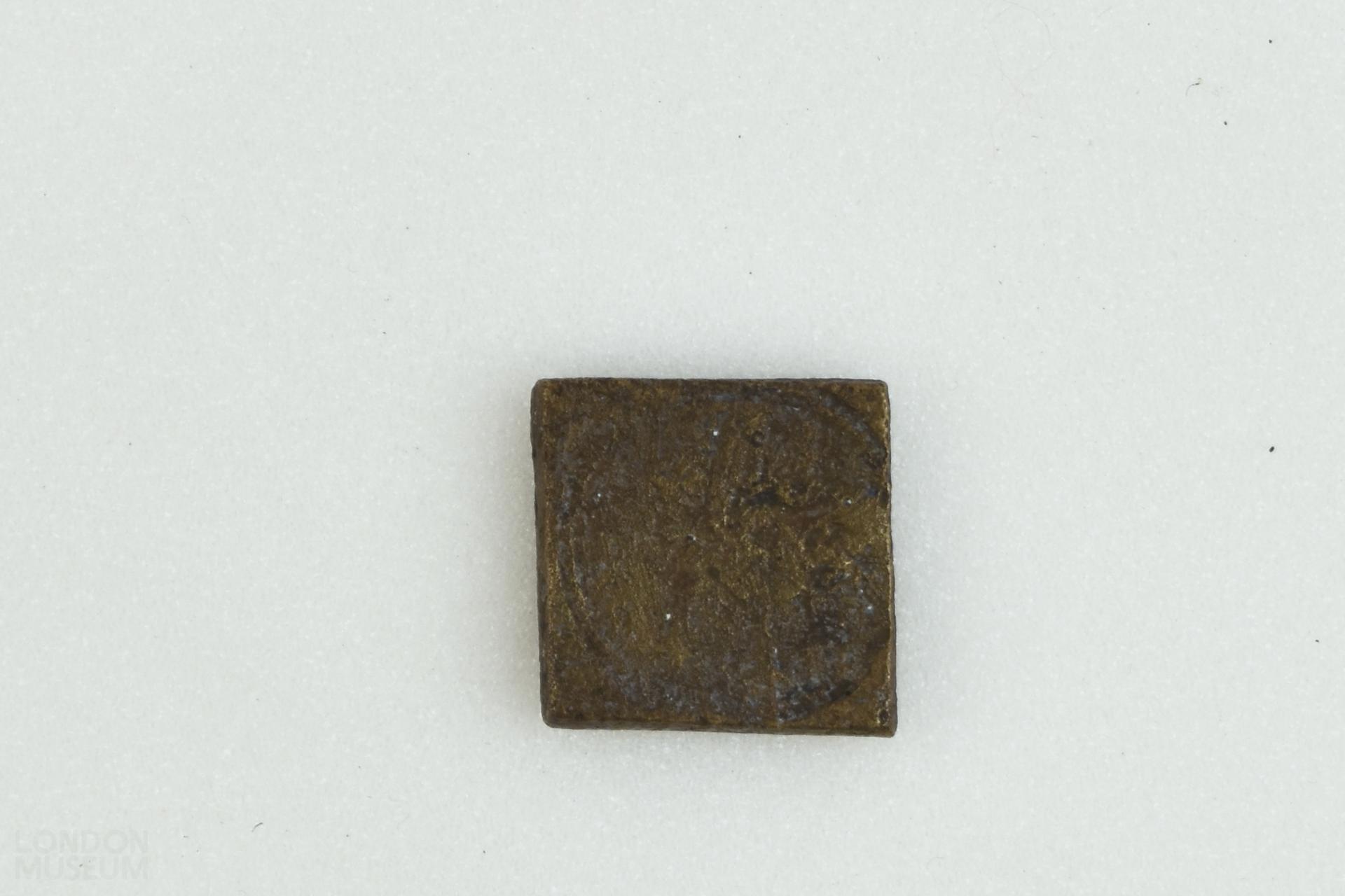 Square coin weight, made of copper alloy; stamped with illegible bust and a crown over XXII/S.