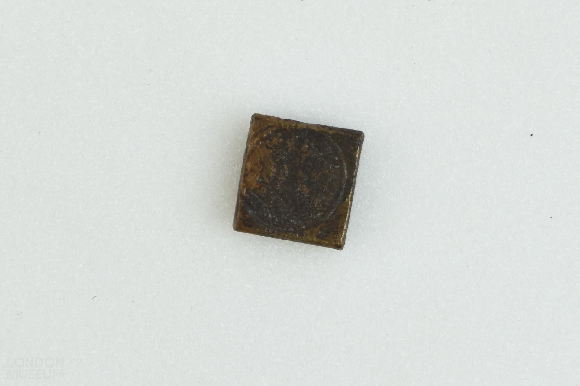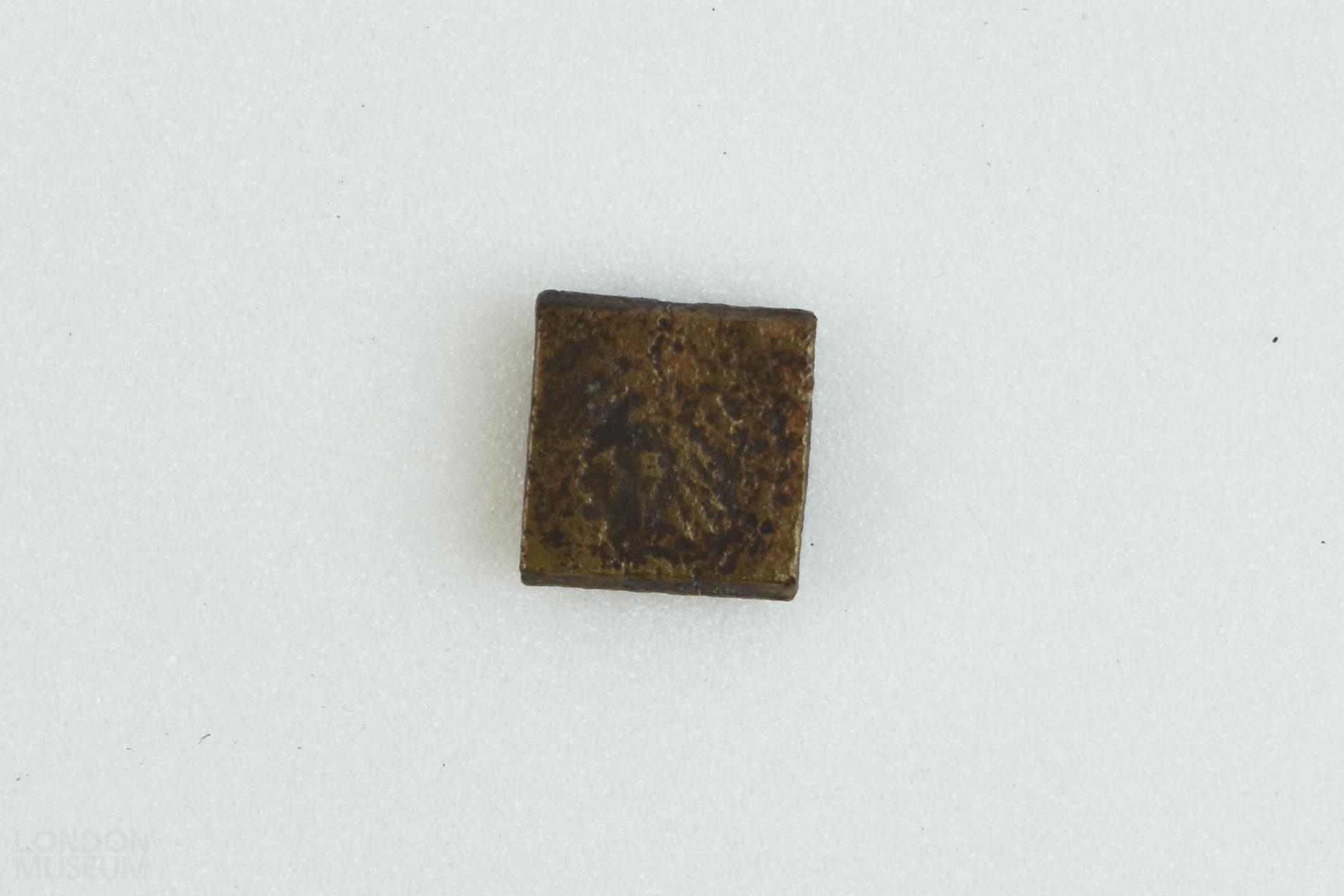 Square coin weight, made of copper alloy. On the obverse, it is stamped with two crowned facing busts within a circle. On the reverse, it is stamped with a hand, 'D I'. Probably issued in Antwerp.