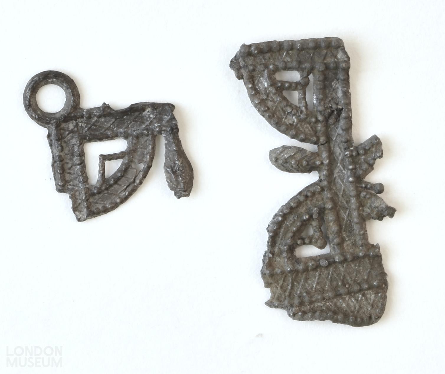 2 fragments of a toy chest panel, both with decorative openwork. Smaller part is a corner fragment featuring a quarter circle and a round hook. Larger part features two quarter circles.