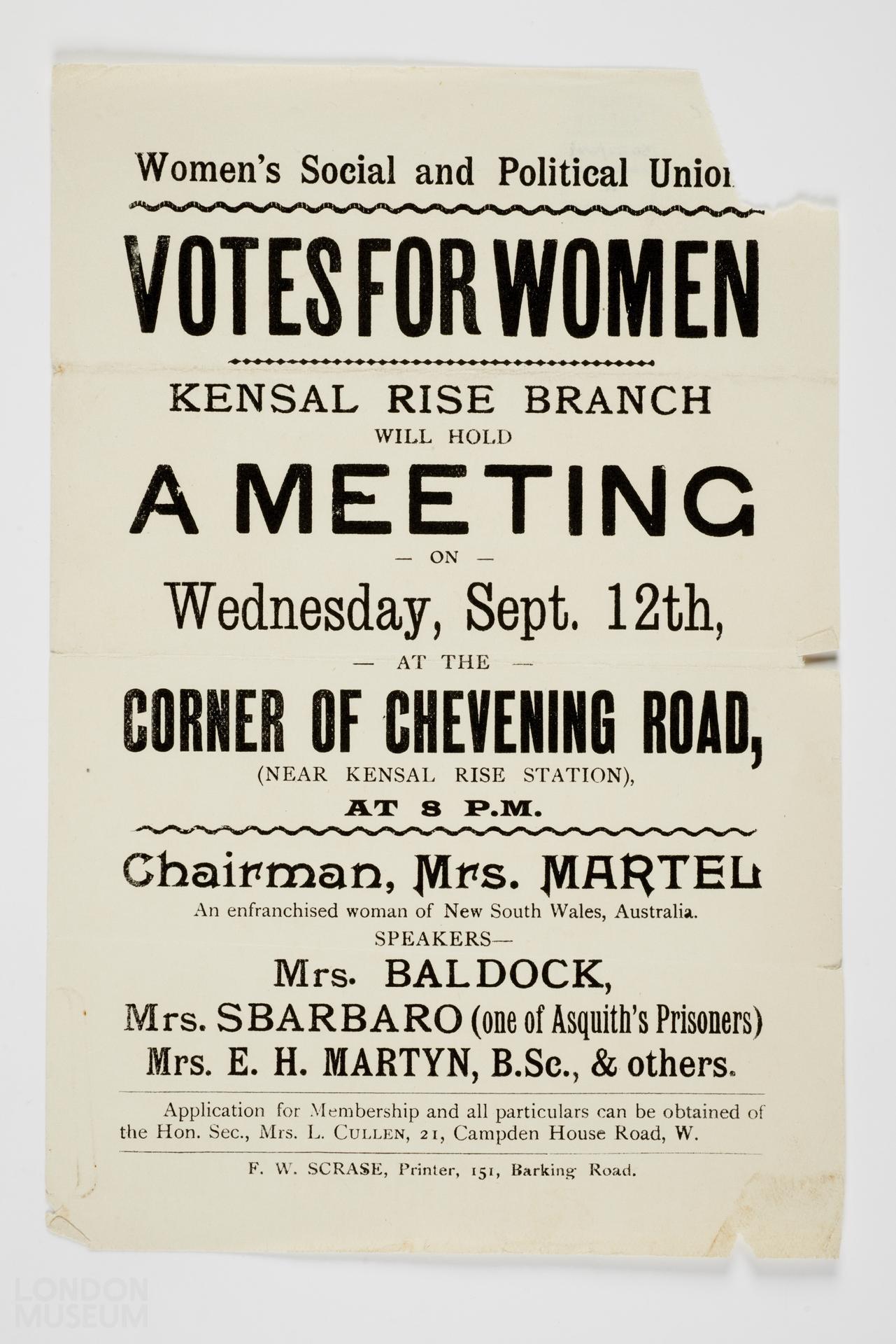 Meeting. Chevening Road, Kensal Rise. Women's Social and Political Union. (One of a group of notices of meetings, demonstrations and processions in London). Part of the collection of objects relating to the Suffragette Movement, given by the Suffragette Fellowship, 1950.