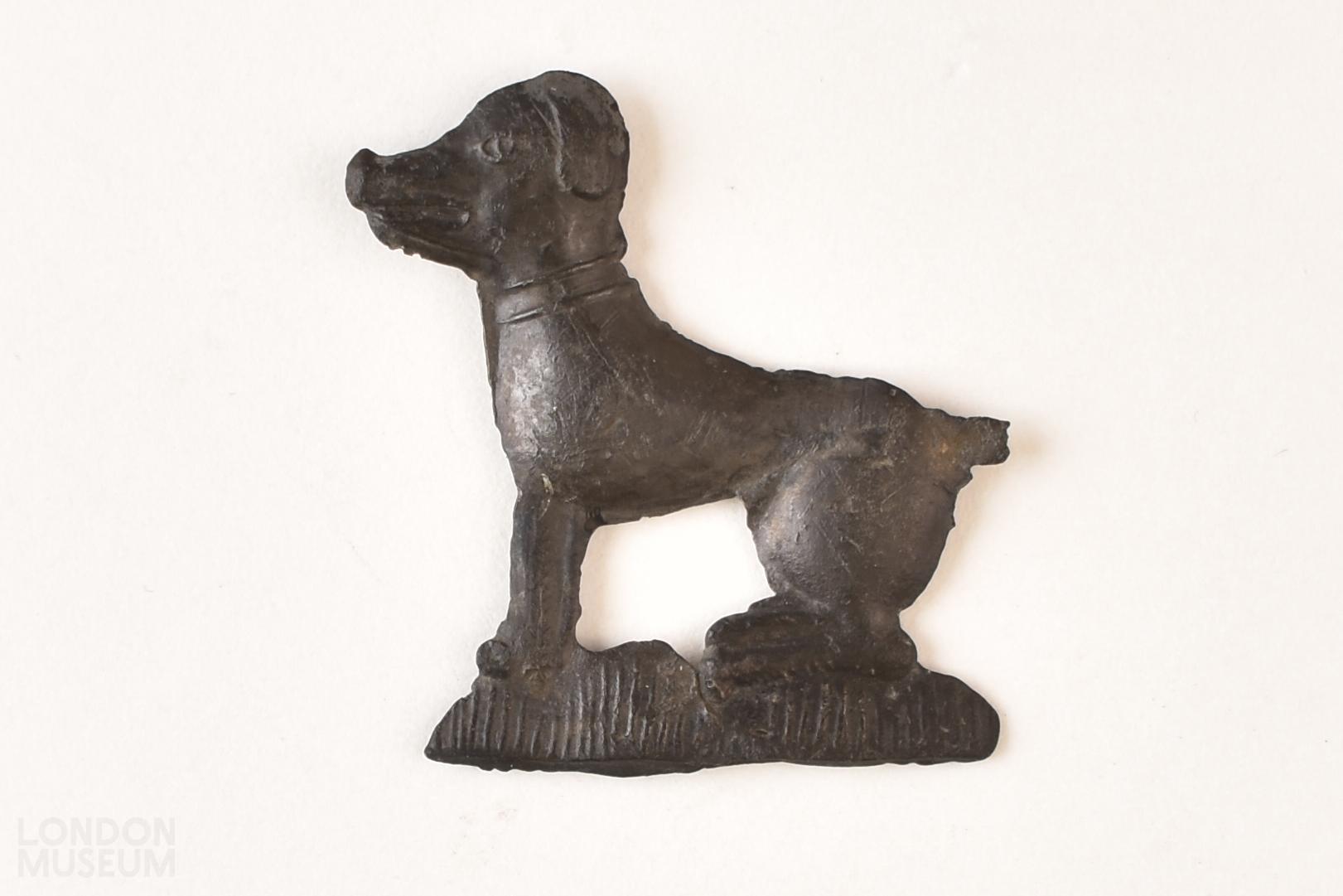 Livery badge of the talbot, dated to the 15th century. The dog is a 'talbot', a hunting dog with long hanging ears and heavy jaws, the badge of the Talbot family, decendents of John Talbot, first Earl of Shrewsbury (d.1453). This badge would have been worn by a servant or supporter of the family. A stone mould in the collection found in London Wall in 1901, was used for casting a series of talbot badges.