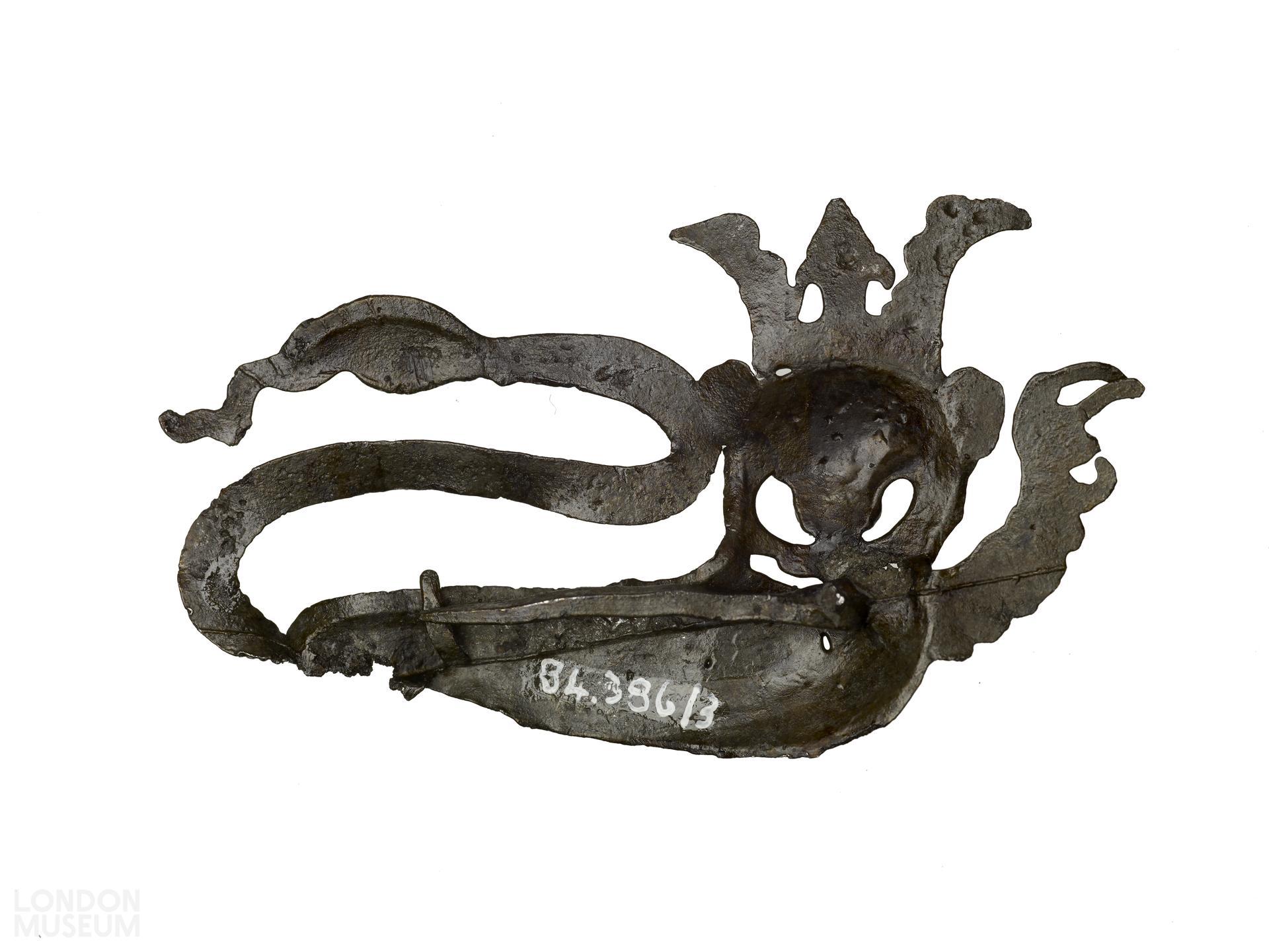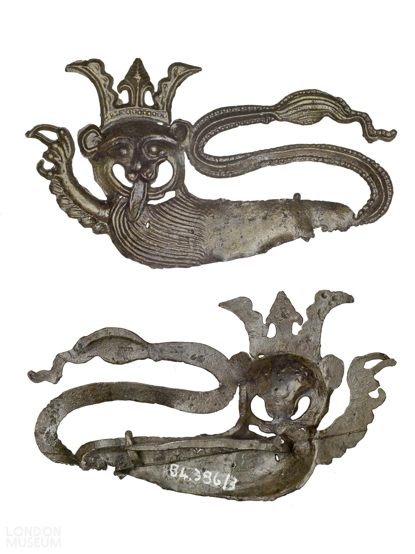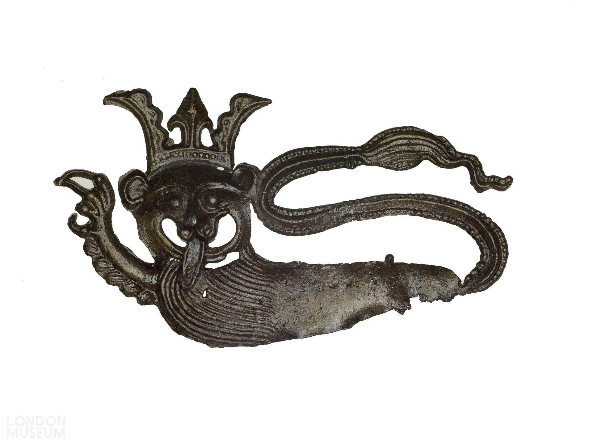 Livery badge in the form of a crowned lion passant regardant. This probably symbolises the lion of England and was perhaps worn as a sign of patriotism in the Hundred Years War.