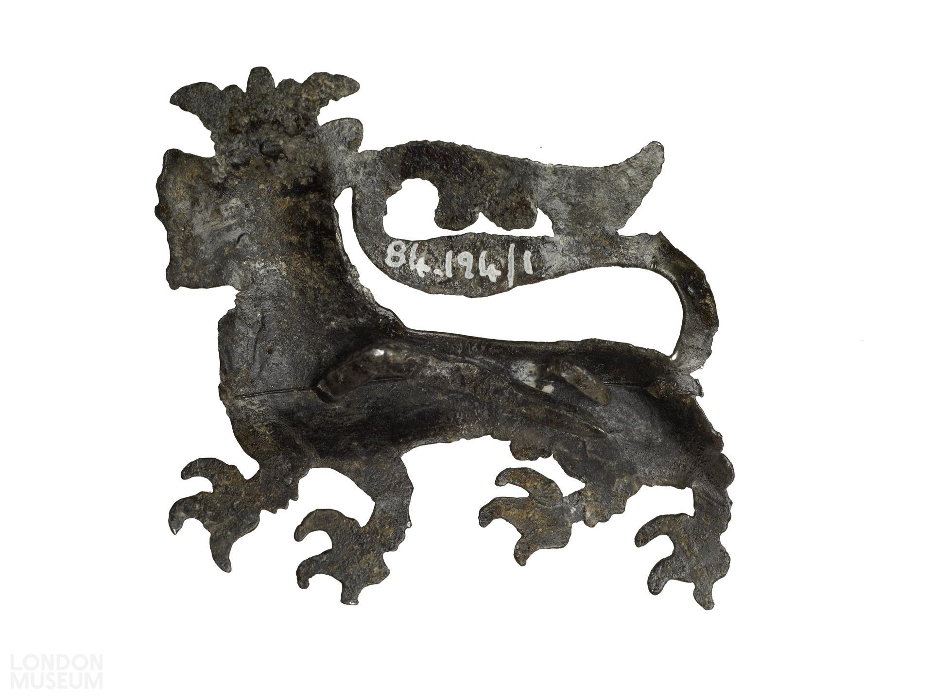 Livery badge in the form of a crowned lion counter-statant. This probably symbolises the lion of England and was perhaps worn as a sign of patriotism in the Hundred Years War.