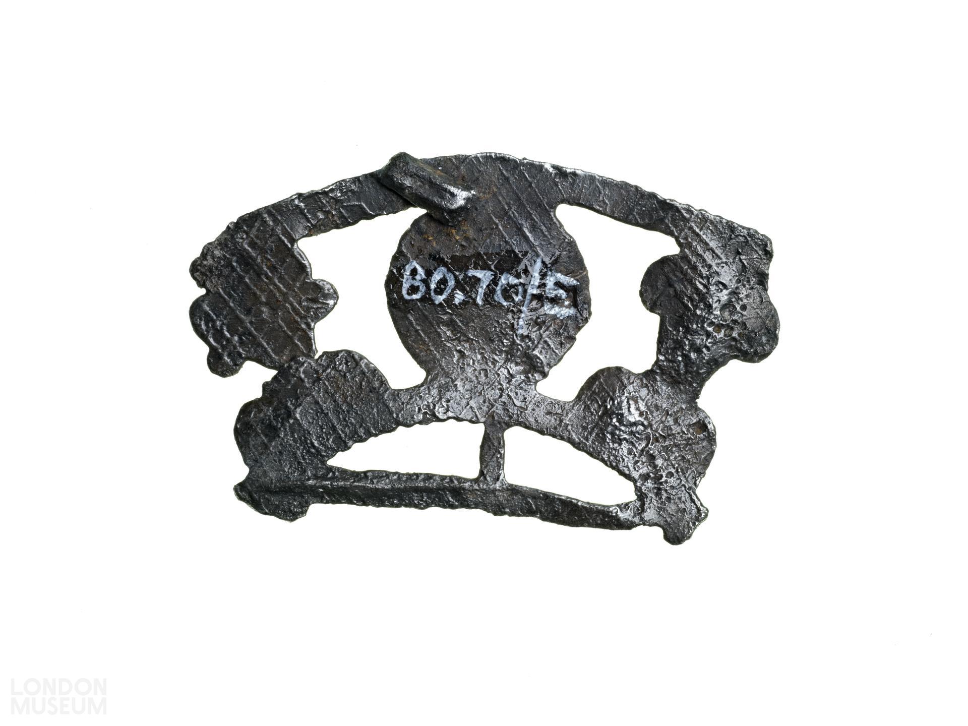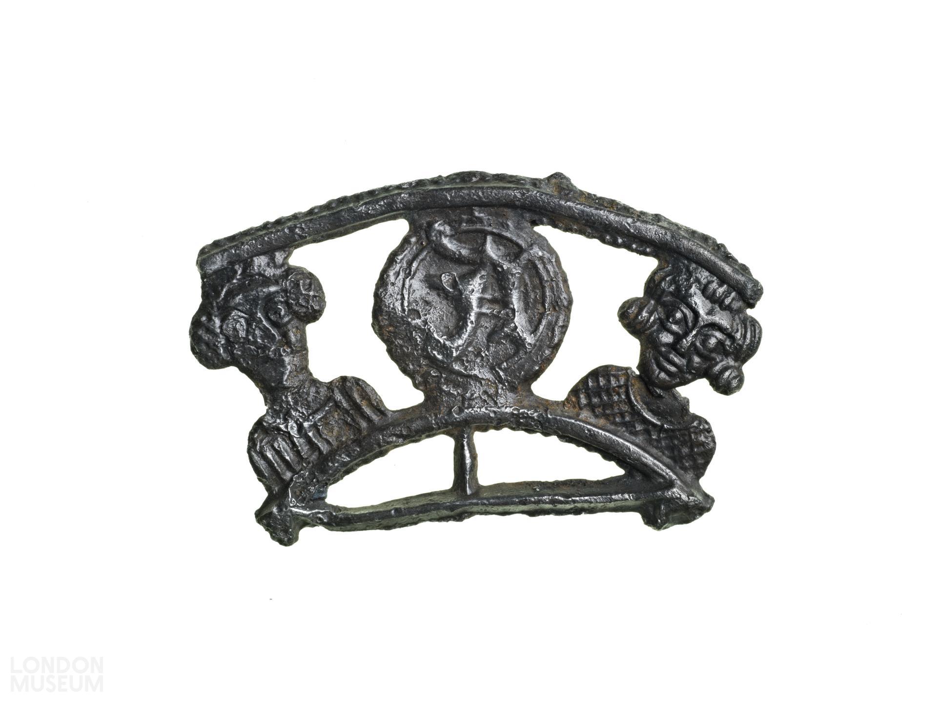 Part of a lead alloy secular badge cast in the form of two busts (one male, one female), seperated by a roundel inscribed with an 'A'.