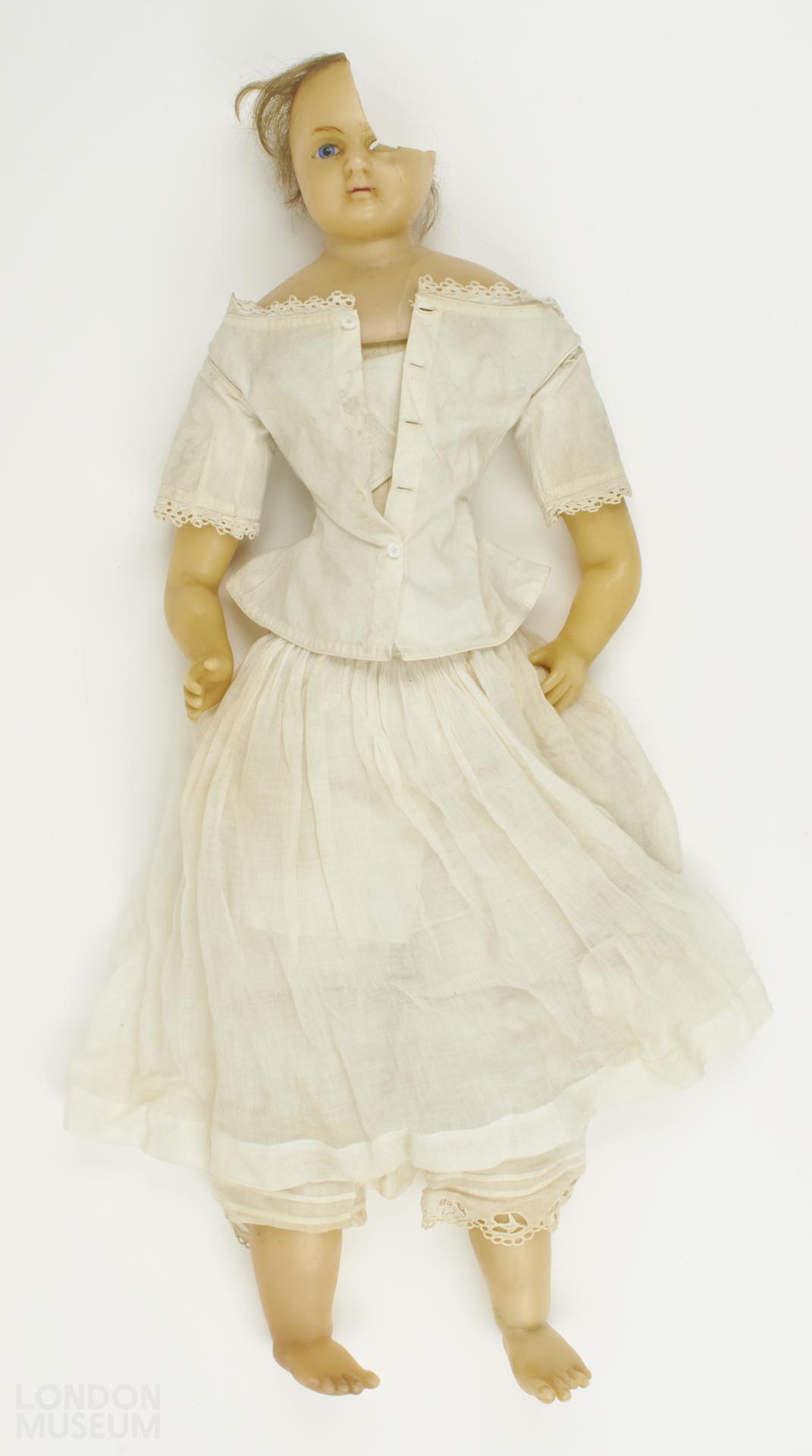 Doll with wax head, half of which is now detached and stored alongside the doll, with painted facial features, blue coloured glass eyes and human hair. With wax arms and legs on stuffed cotton body. Dressed in a white cotton button front bodice, with a white cotton skirt and white cotton drawers.