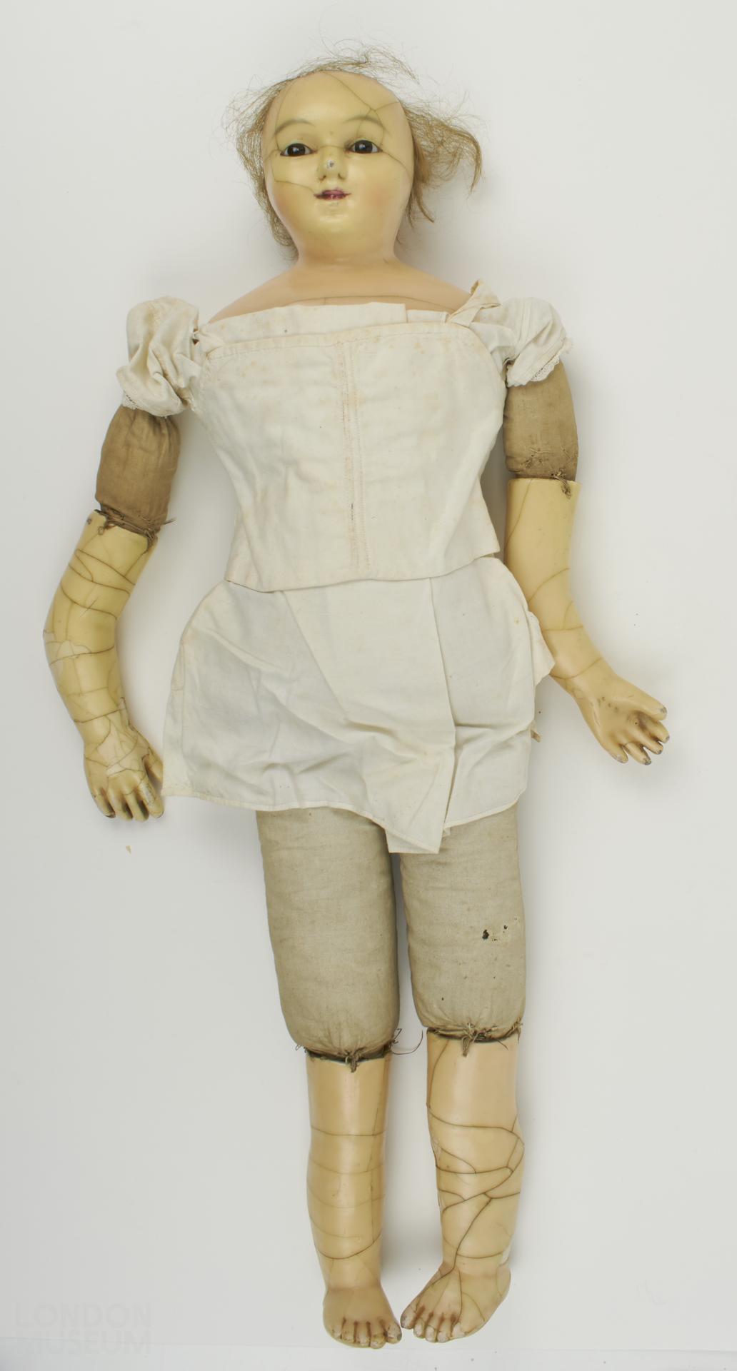 Doll with wax over composition head, forearms and lower legs on cotton body stuffed with cotton wool. With painted facial features, glass eyes and human hair. Dressed in cotton dress and wool and cotton petticoats.