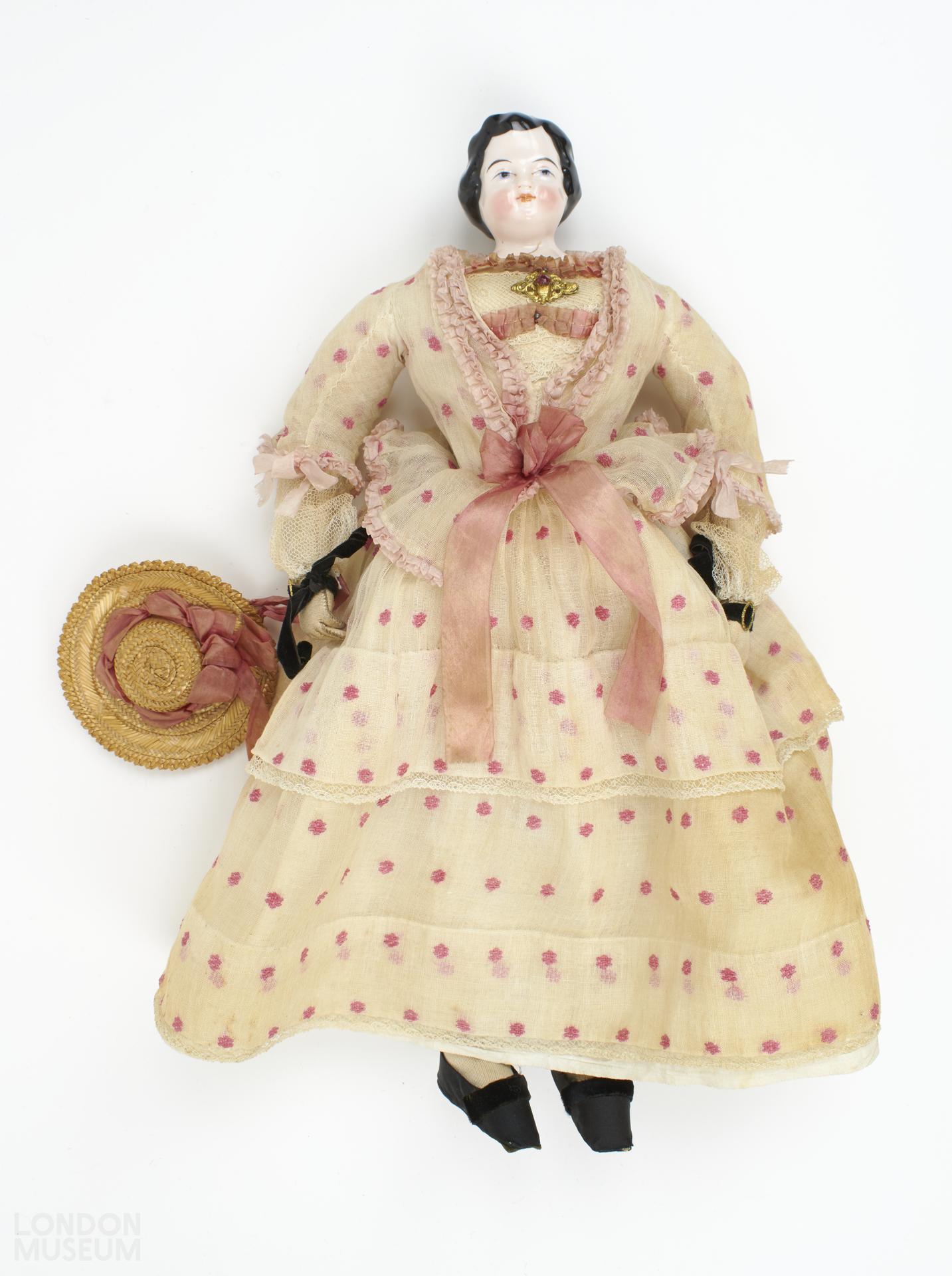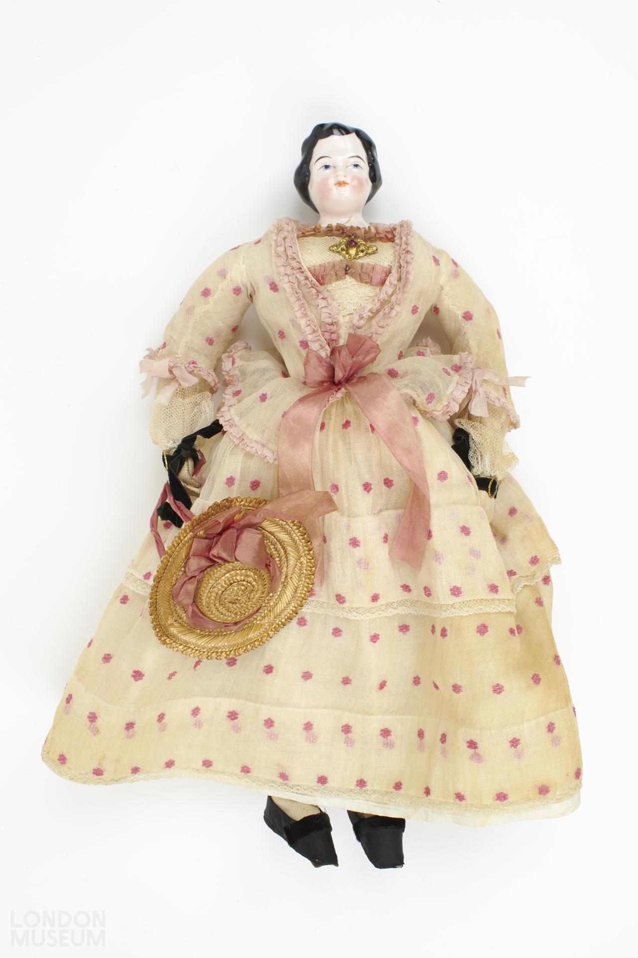 Doll with glazed and painted porcelain head. Stuffed leather arms, legs and body. Dress of white organza woven with pink spots and trimmed with silk ribbon, leather soled shoes and a hat of plaited straw.
