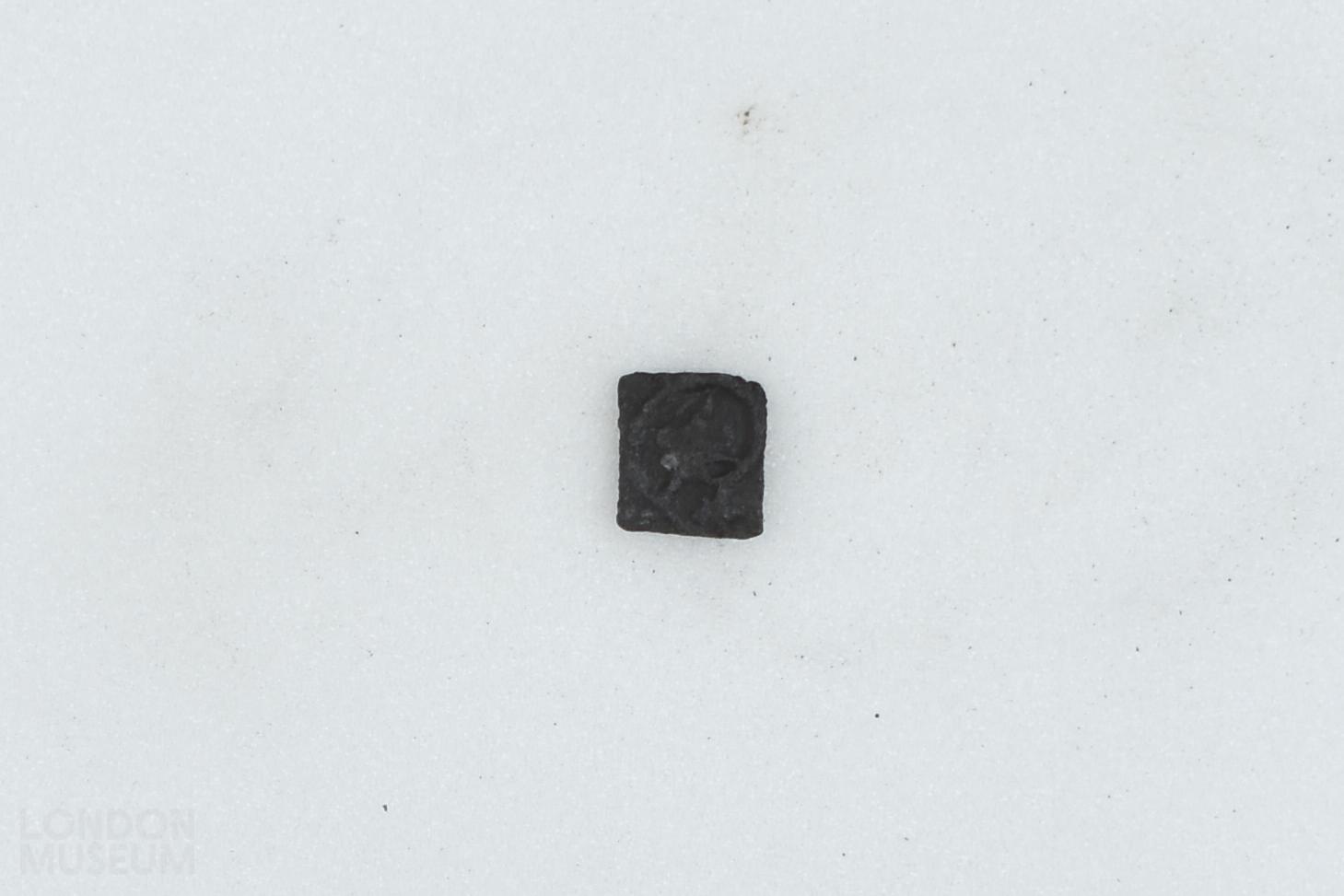 Thin square lead weight. With foliate? design on top face, plain on reverse.