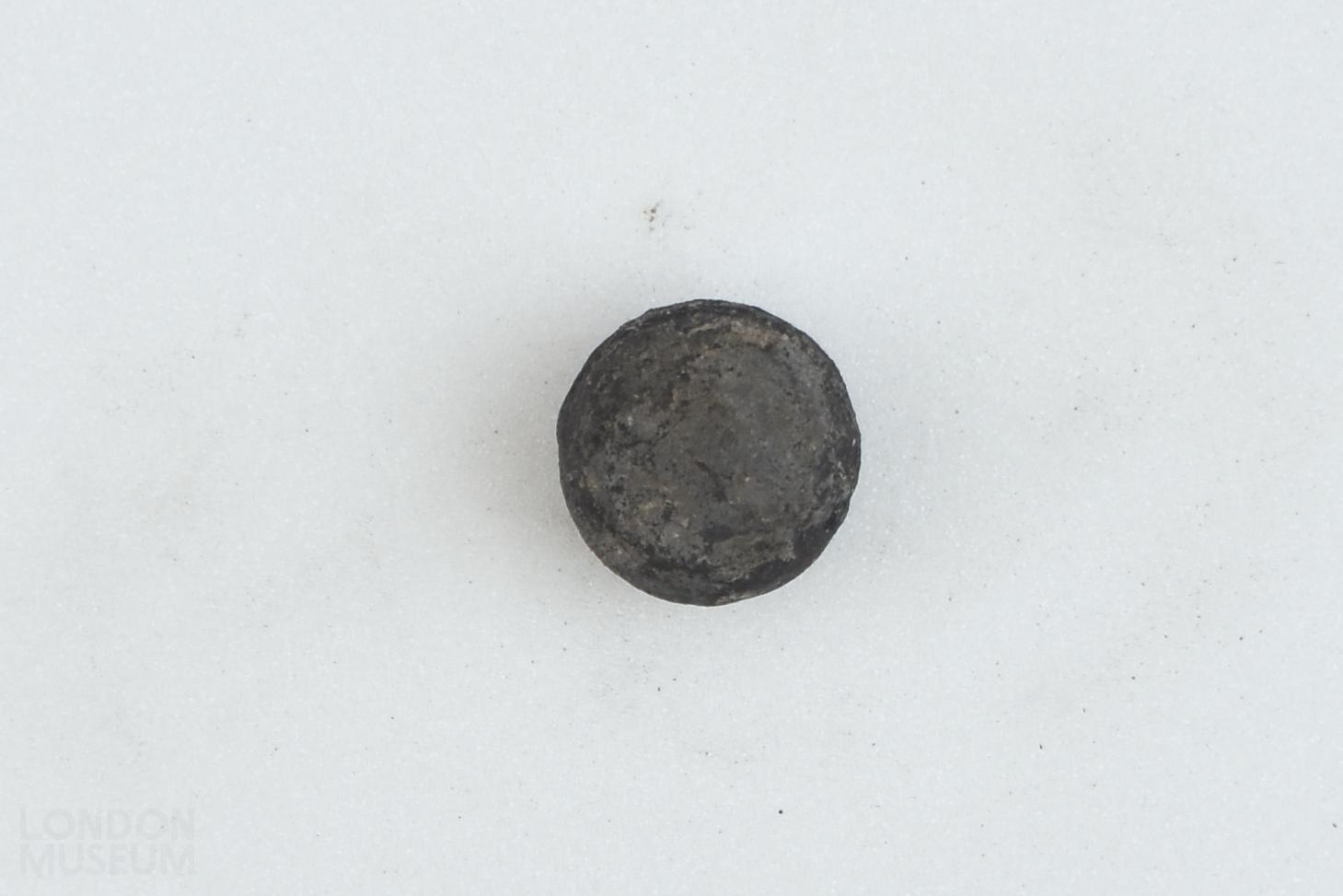 Lead weight in the form of a truncated sphere. Flat top and bottom faces with rounded edges.