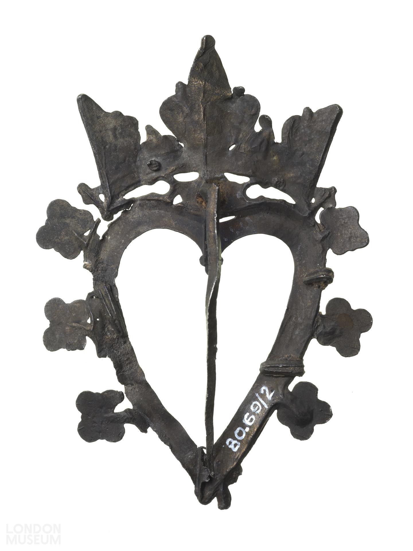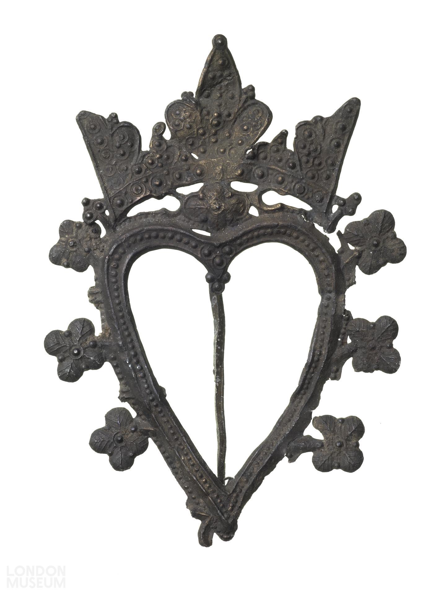 Lead alloy badge. Crowned heart decorated with pearled design, and surrounded by six quatrefoils; with pin on reverse.