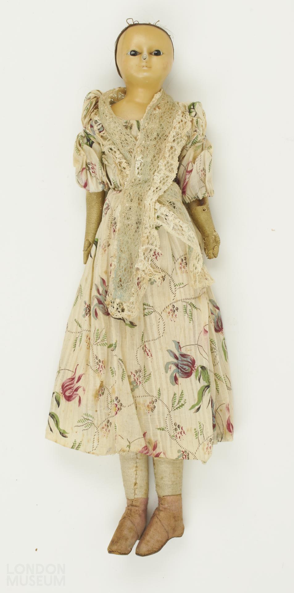 Dressed doll with wax over composition head, glass eyes and painted features. With stuffed leather arms resembling gloves on cotton body and legs stuffed with sawdust. Dressed in floral printed cotton dress and cloth books with leather soles. Originally the doll had a wig of human hair, little now remains.