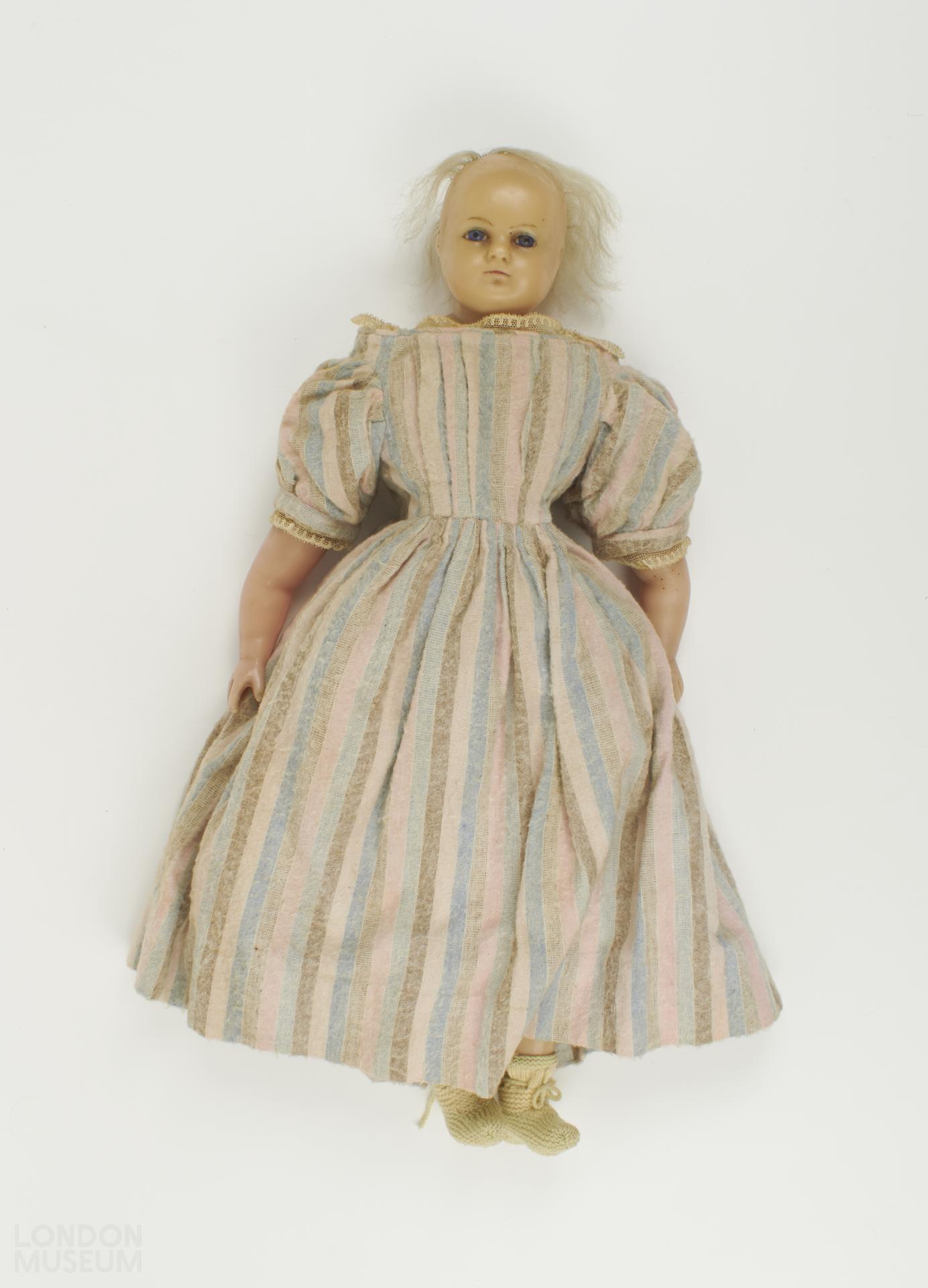 Doll with wax head, painted facial features, glass eyes and mohair hair. With wax arms and legs on stuffed cotton body. Dressed in clothes of cotton and wool, a striped blue pink and brown dress with lace edging at neck and knitted woollen bootees. Tag with doll reads: 1860-1870.
