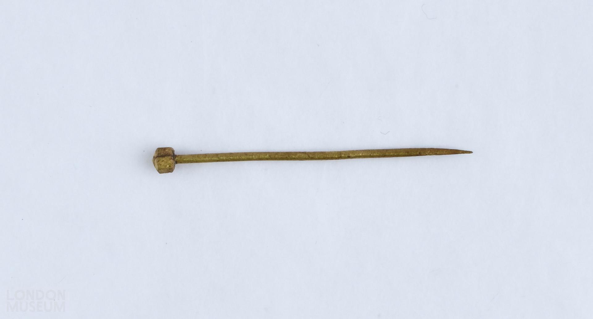 Pin made from copper alloy. Heptagon knop. Metal slightly bent.