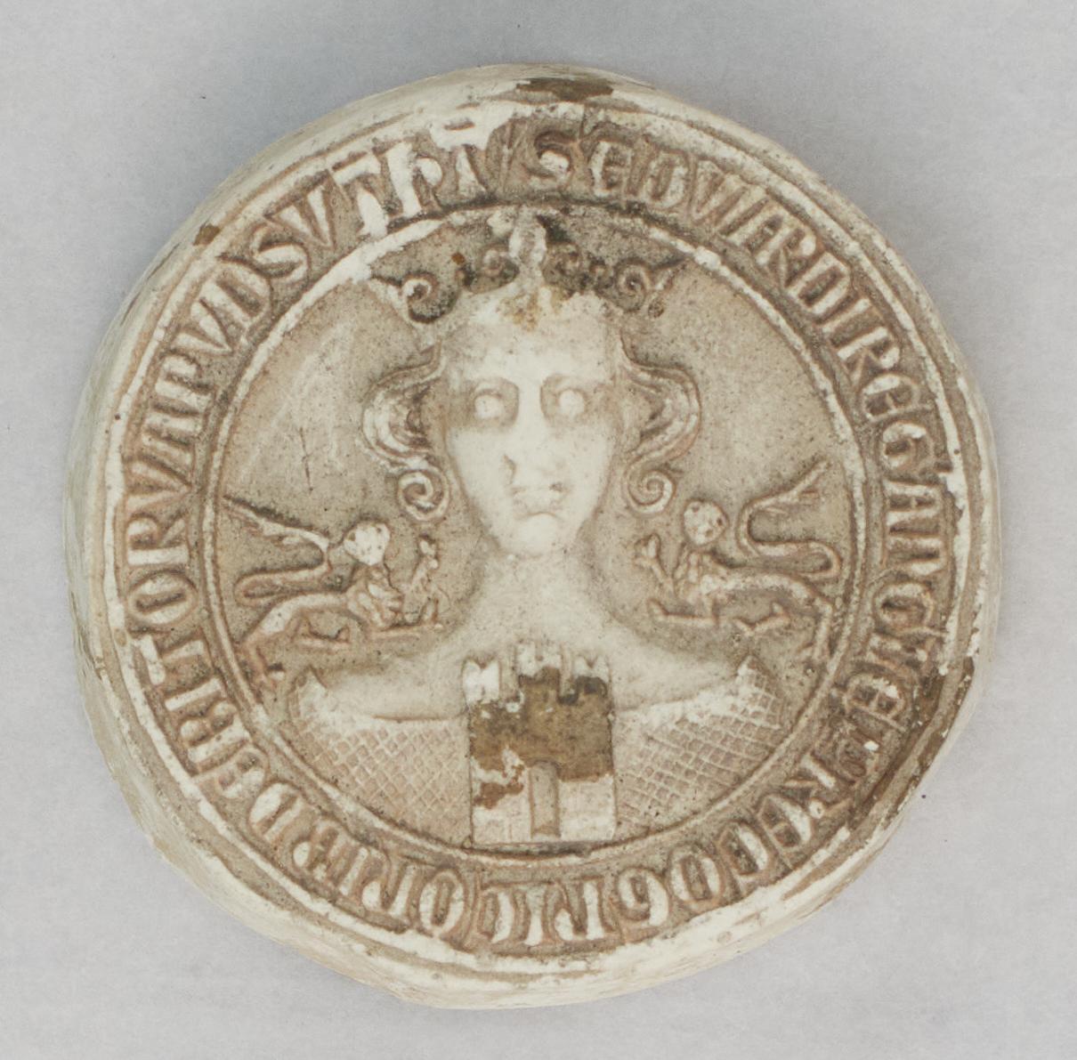 Replica yellow wax seal impression of the Royal seal of Southampton with king and castle motif . Original seal dated to the medieval period.
