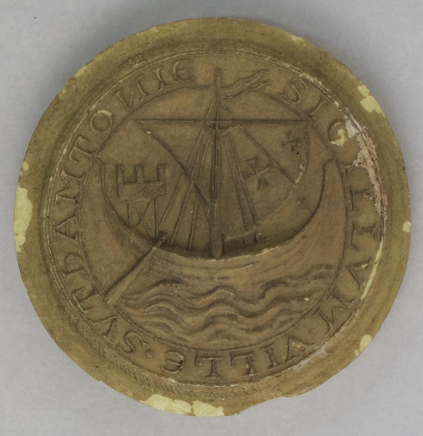 Replica wax seal impression of the seal of Southampton with ship motif. Original seal dated to the medieval period.
