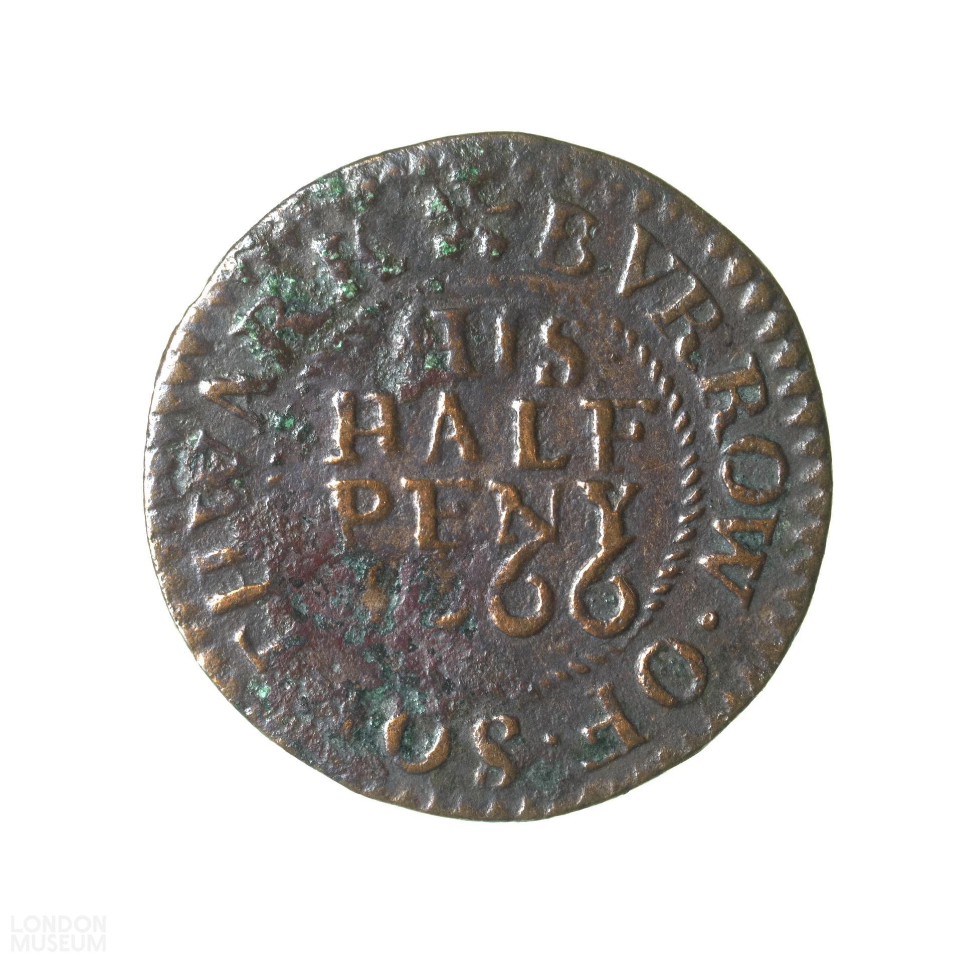 Boyne & Williamson (1891) reference Southwark number 35A; Obv inscription: CHRISTO. FARRINGTON. IN. YE (around field, in Roman capitals) Device = An eagle C.L.F. (triad of initials in Roman capitals around sign, in field); Rev inscription: BVRROW.OF.SOVTHWARK (around field, in Roman capitals) Device = HIS / HALF / PENY / 1666 (in four lines of Roman capitals, in field).