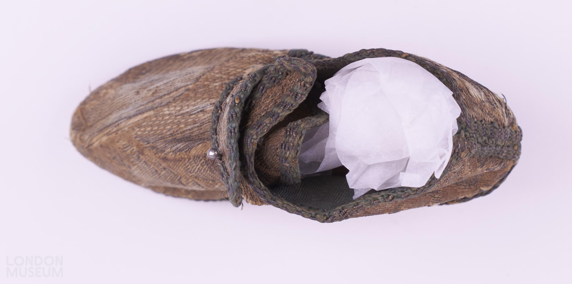 Single doll's shoe of dark yellow or light brown brocaded silk, with a heel.
