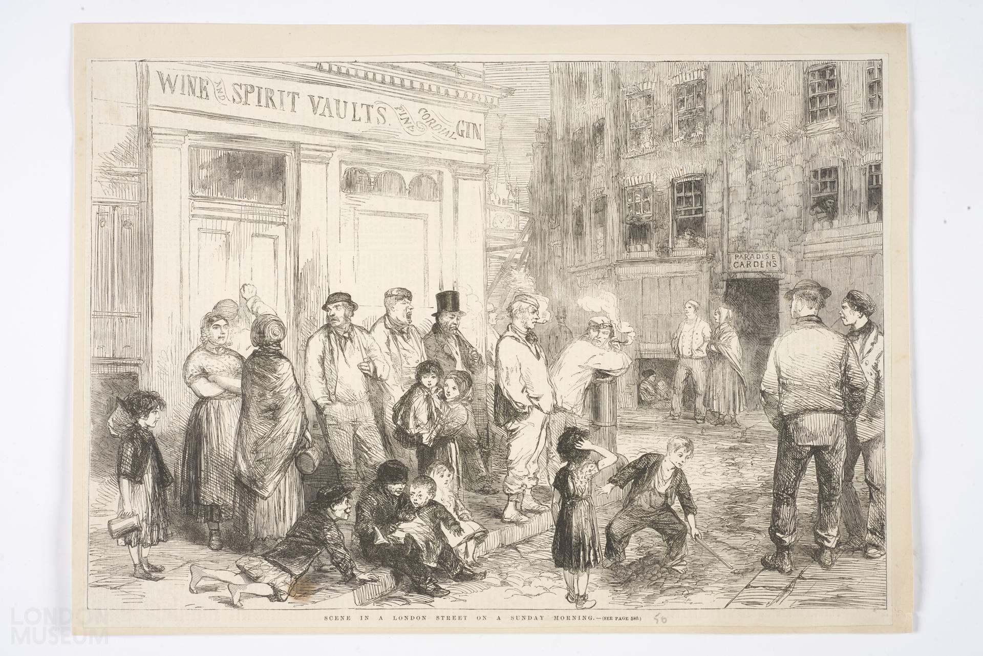 Men, women and children stand talking, smoking & playing in a backstreet (there is a sign "Paradise Gardens") outside a pub - "Wine and Spirit Vaults - Fine Cordial - Gin" - waiting for it to open. A church clock in the background shows five to one (or maybe five past eleven). One man knocks at the closed pub door.