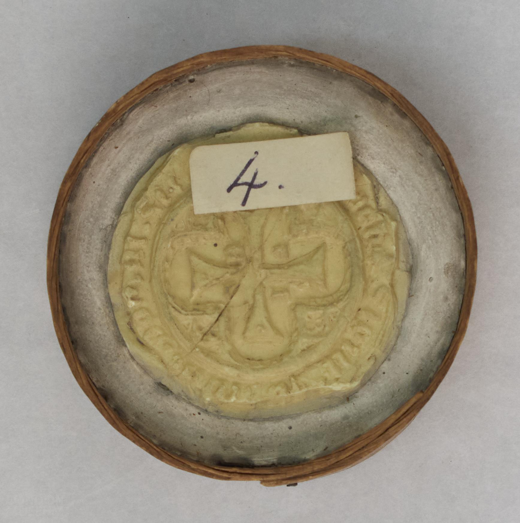 Replica wax seal impression of the seal of the Crutched Friars, London. Original seal dated to the medieval period.