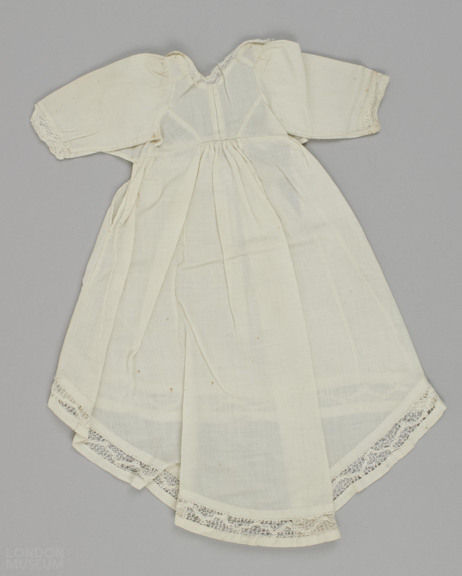 Doll's white cotton low stomacher dress inset with lace, at hem, neck and cuffs. Includes train.