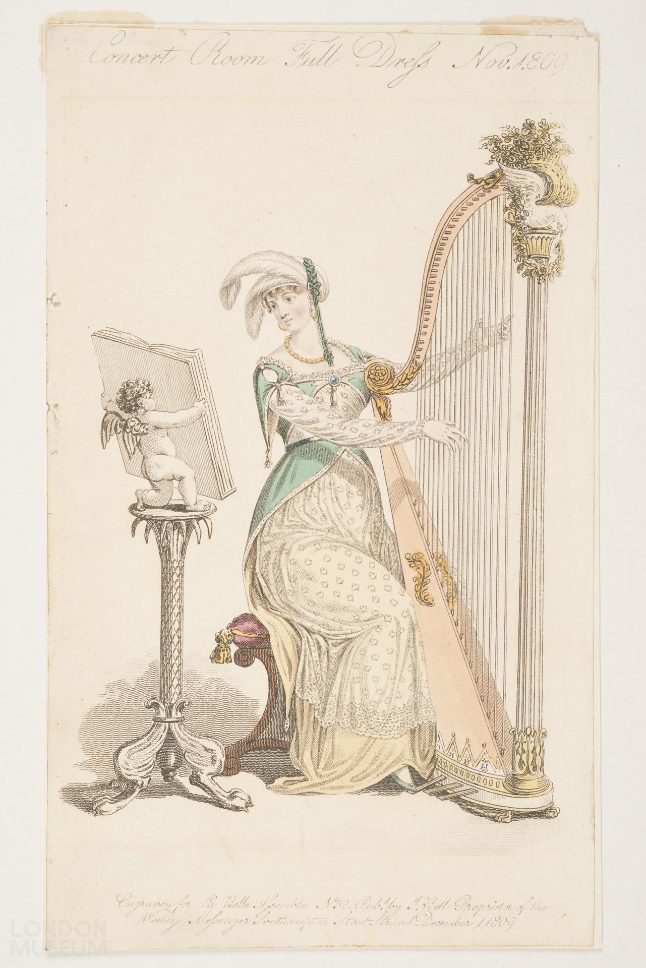 Coloured fashion plate titled 'Concert Room Full Dress November 1809'. Published by J Bell for La Belle Assemblée.