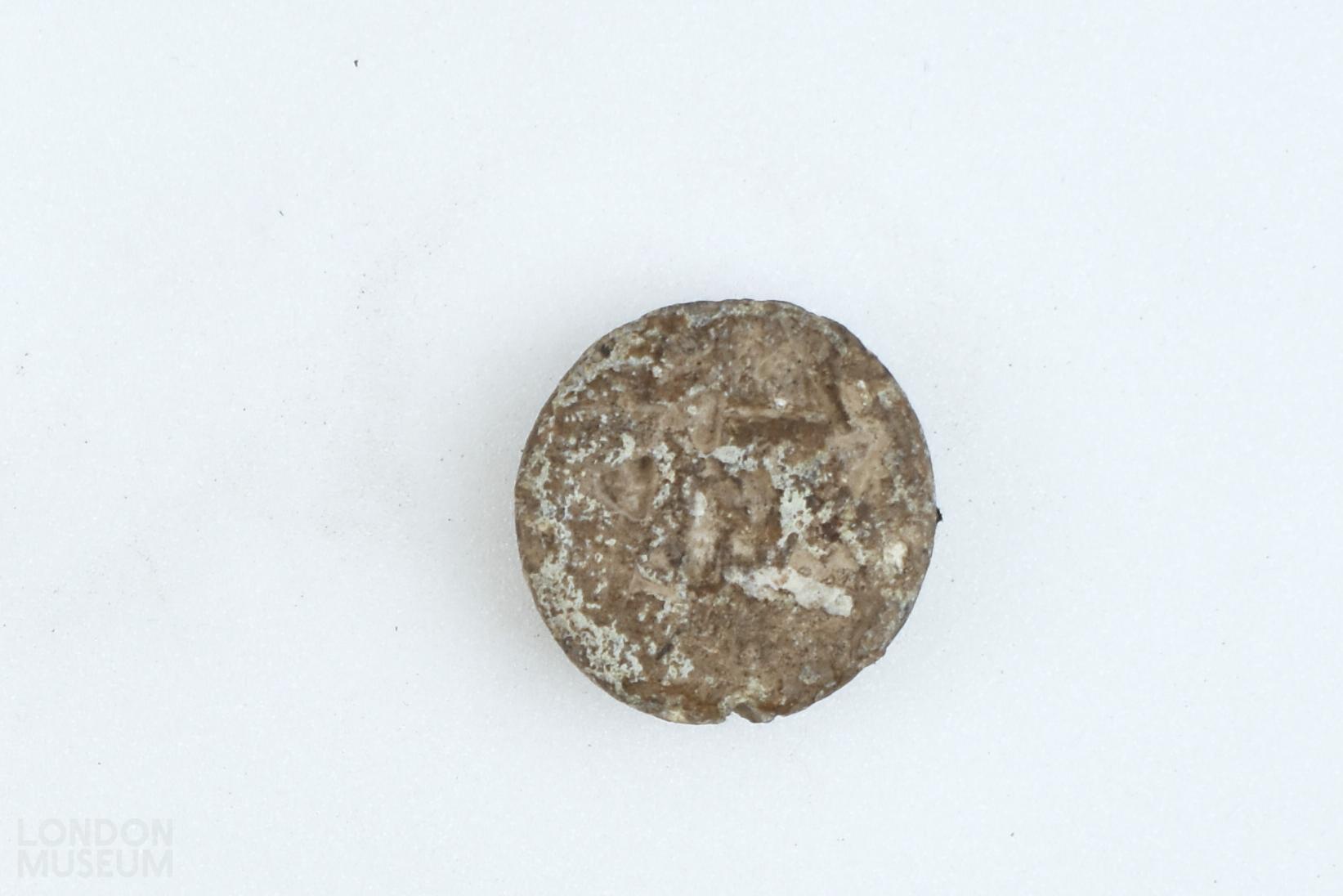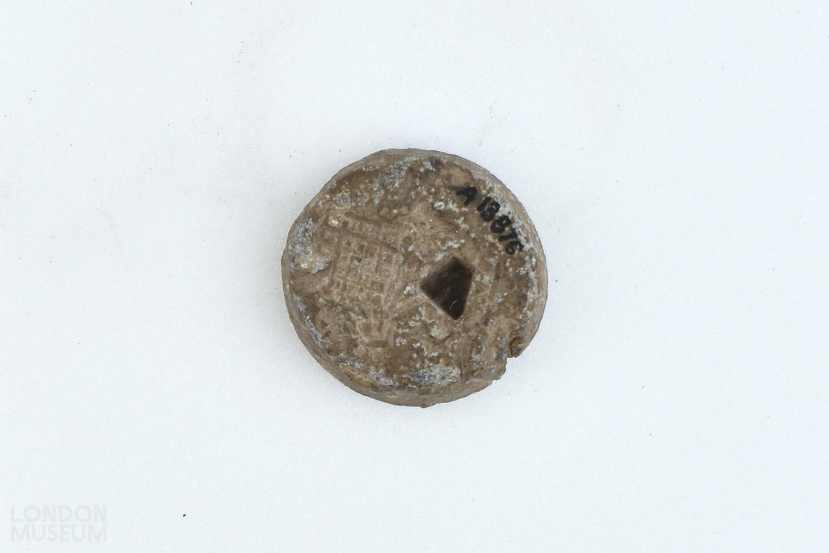 Lead alloy disc weight. Stamped with 'A' (Avoirdupois) and a portcullis.