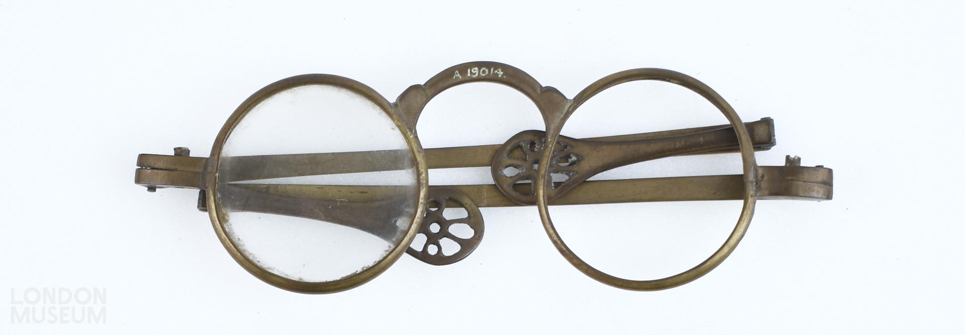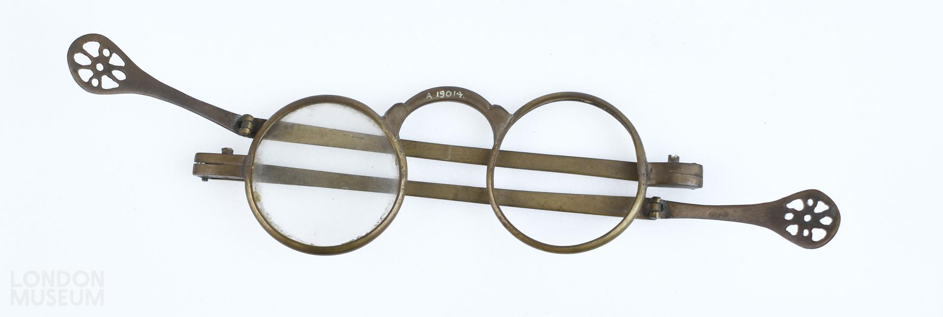 Pair of circular spectacle frames of copper alloy, hinged sides.