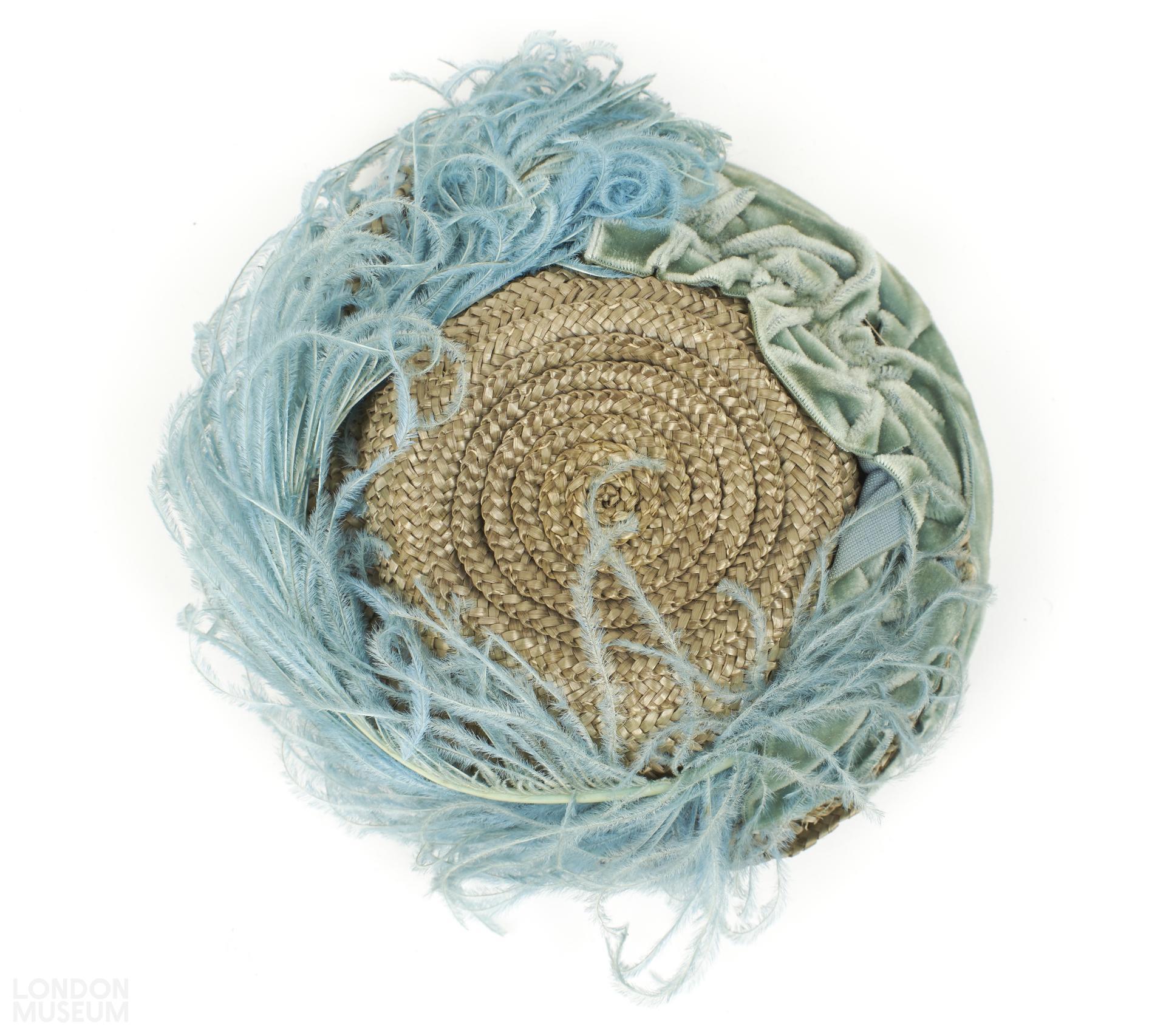 Doll's straw hat with green blue textile and feather decoration.