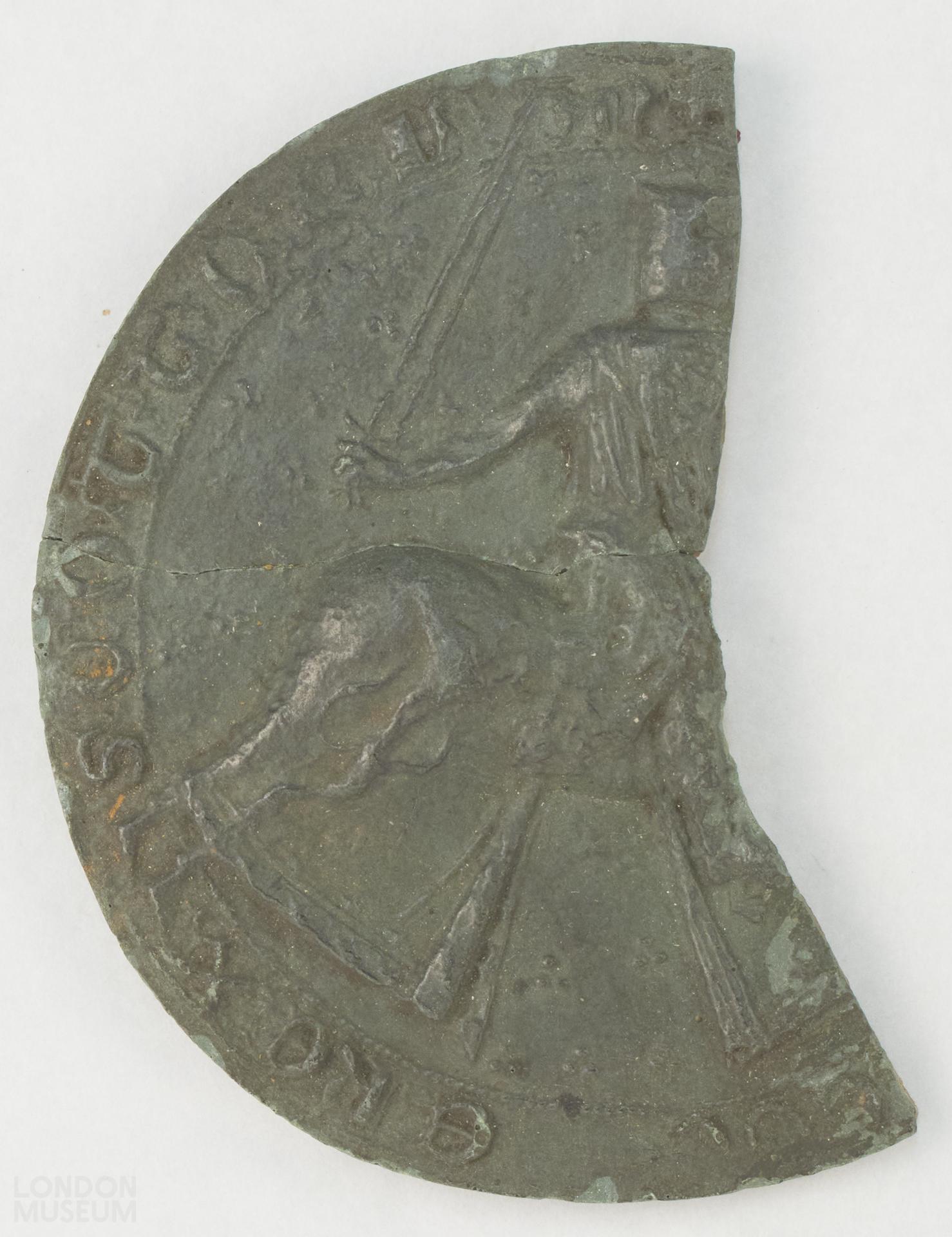 Fragment of a replica green wax seal impression of the seal of Alexander II, Scotland. Original seal dated to the mid-late 13th century.