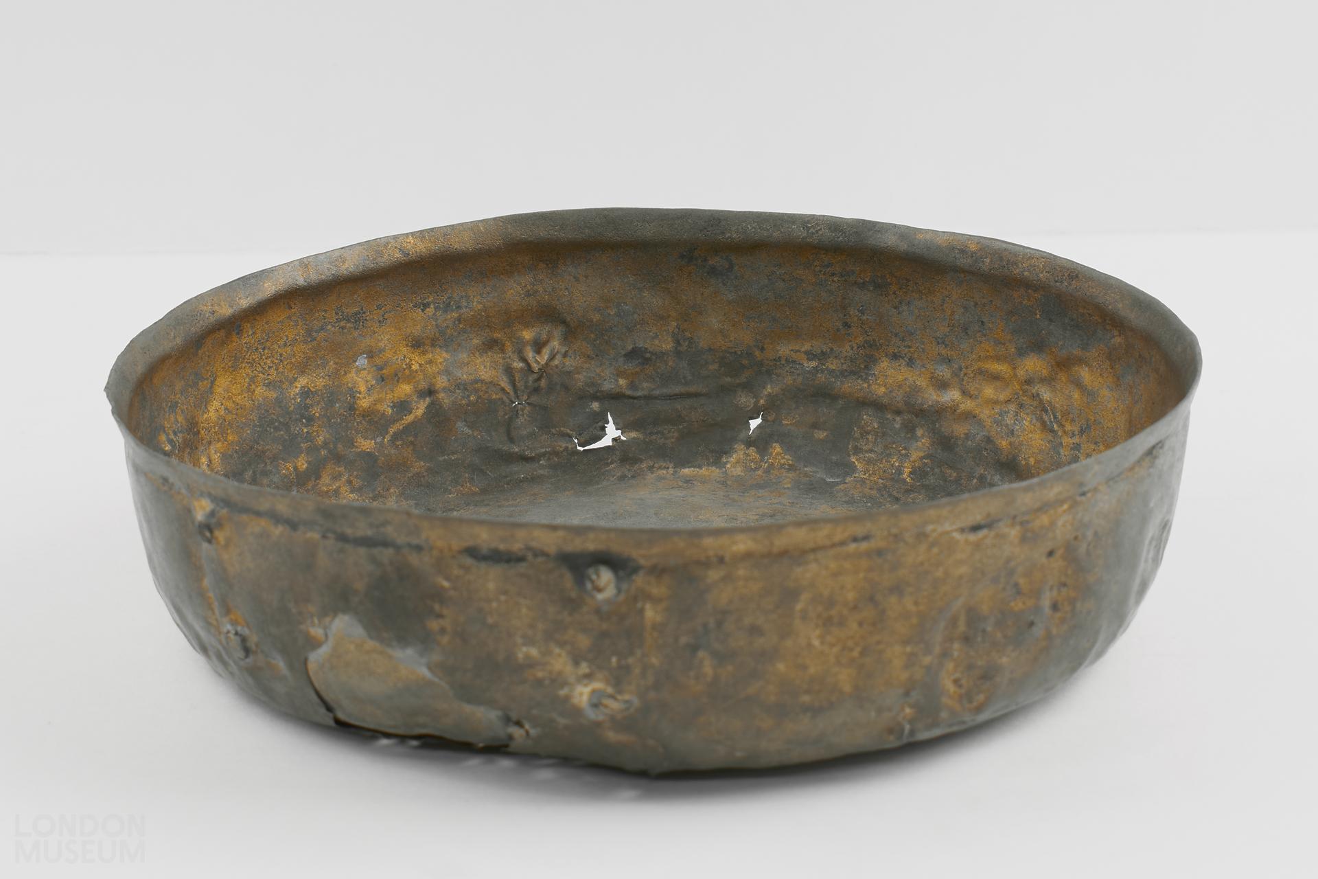 Copper alloy bowl, repaired with patch work piece of rectangular metal bolted over hole in side of bowl.