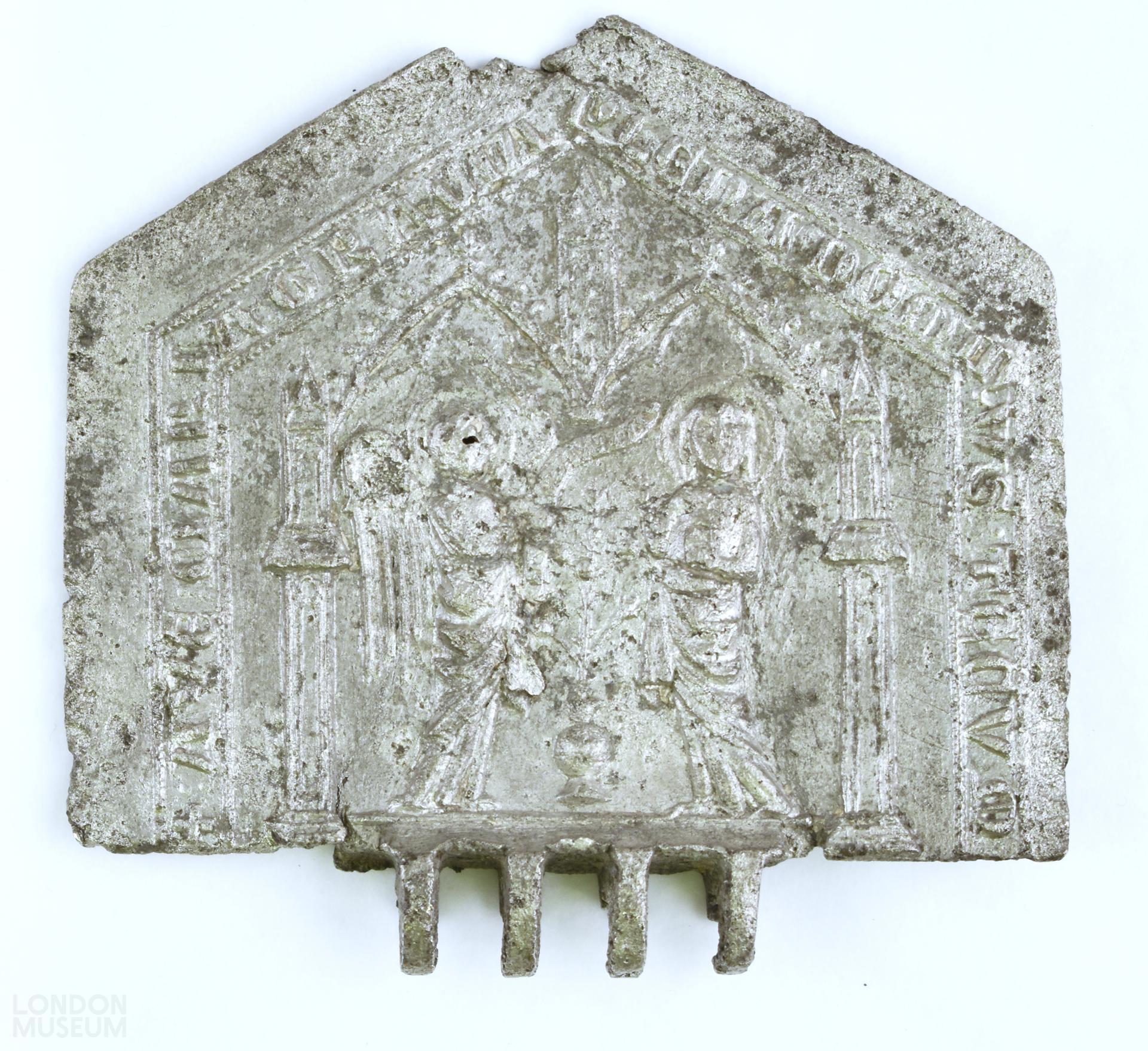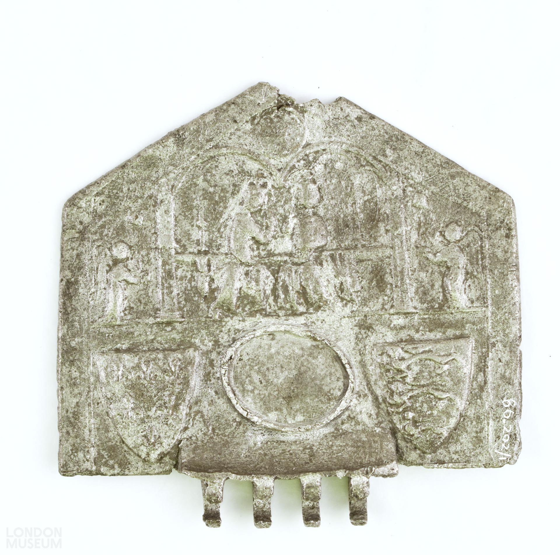 Incomplete lead alloy hinged lid that probably came from a hexagonal shaped salt (or pyx). Annunciation scene in relief, inscribed '+:AVE:MARIA:GRACIA:PLENA:DOMINVS:TECVM' on one side and on the other side is the Coronation of Virgin, and arms of France and England.