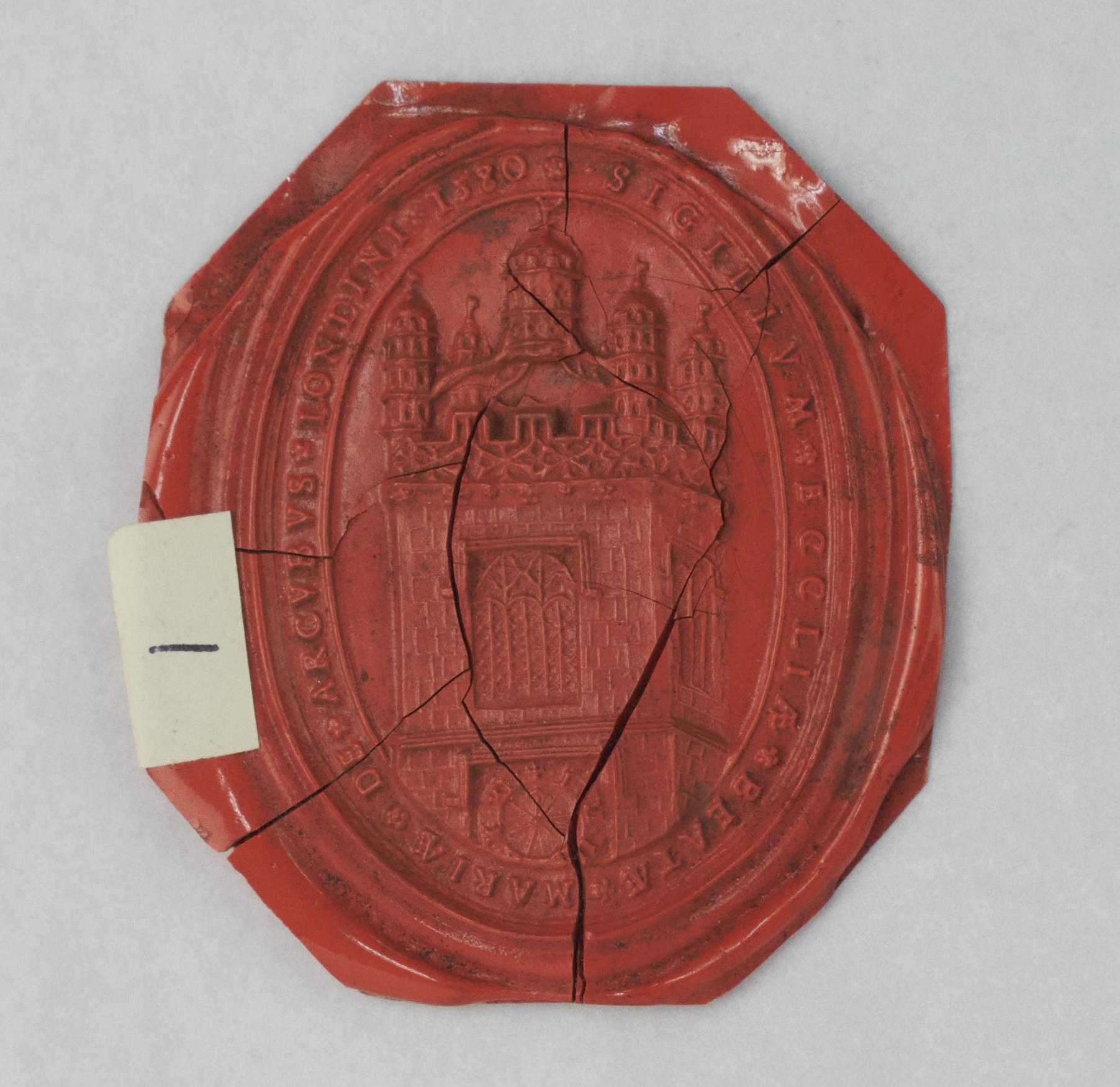 Replica red wax seal impression of the seal of St Mary-le-Bow Church. Original seal dated to the late 16th century.