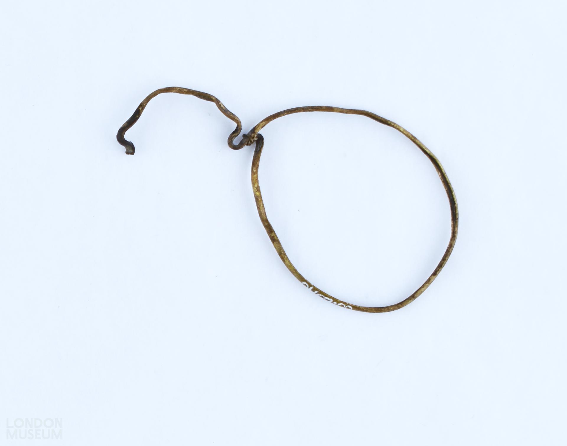 Part of spectacles. Strip of u section, forming nose piece and rim of one eyeglass. U bridge section is bent.