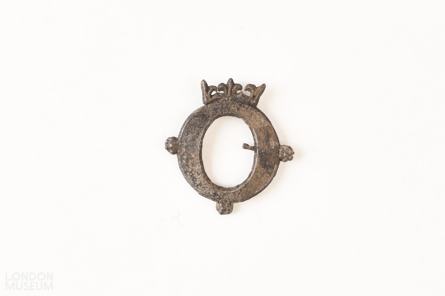 Lead alloy secular badge in the form of a crowned letter 'O'.