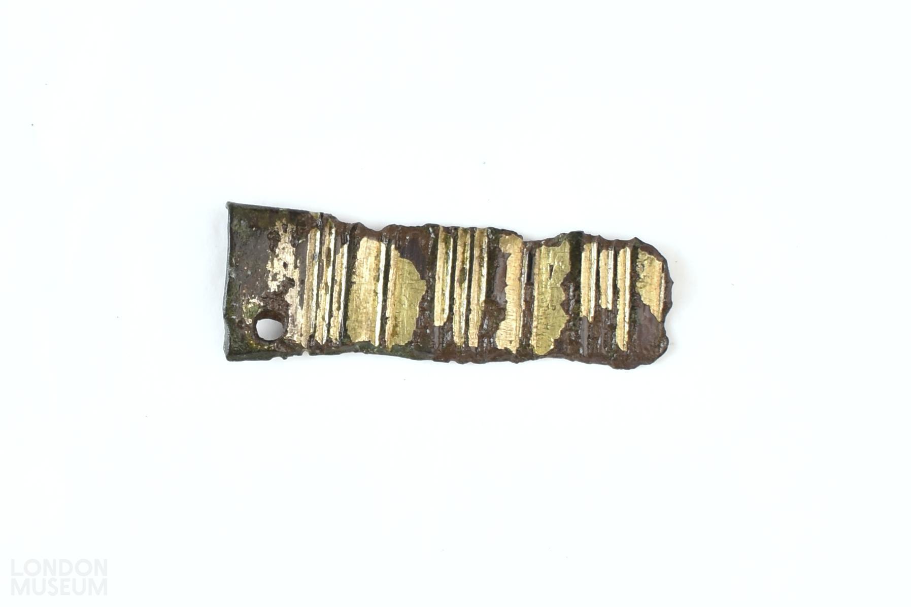 Belt chape, dated to the Saxon period, found with an inhumation at Mithcam cemetery. A19900-A19904 found together and with a stray skull.