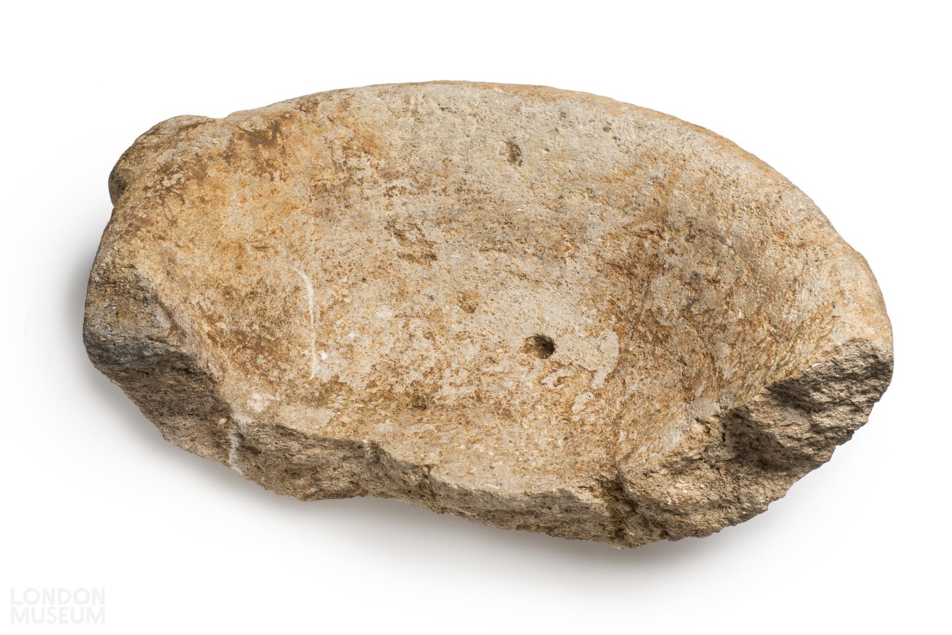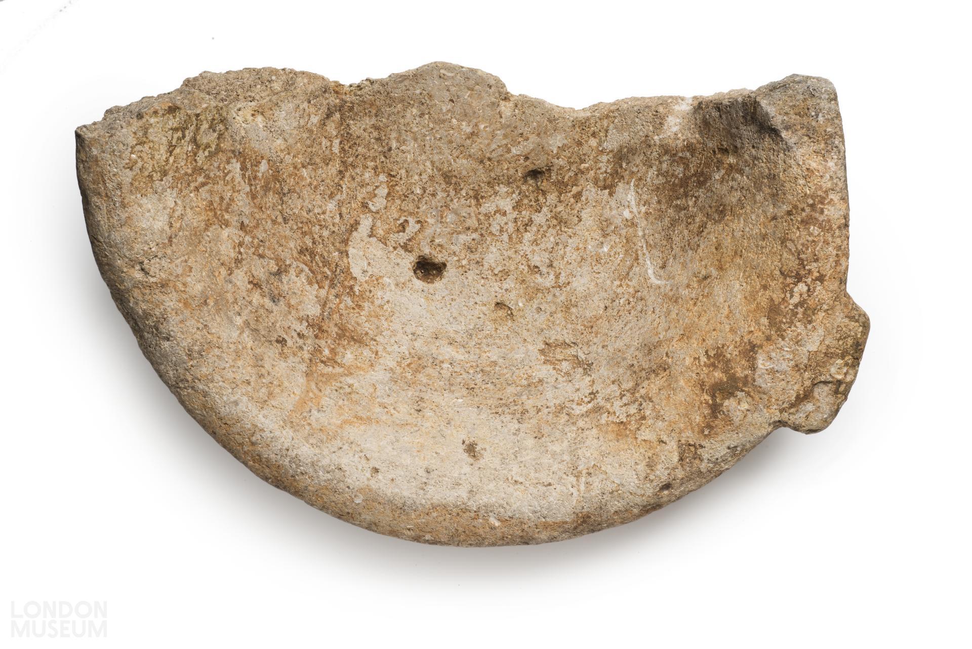 Jurassic shelly limestone. Mortar, half remaining, with rectangular side lug, one of a pair, set level with the top of the rim; shallow foot ring. The exterior has been chiselled and roughly smoothed, with a distinct band of finer chisel marks just below the rim; the interior is worn smooth, probably from use.