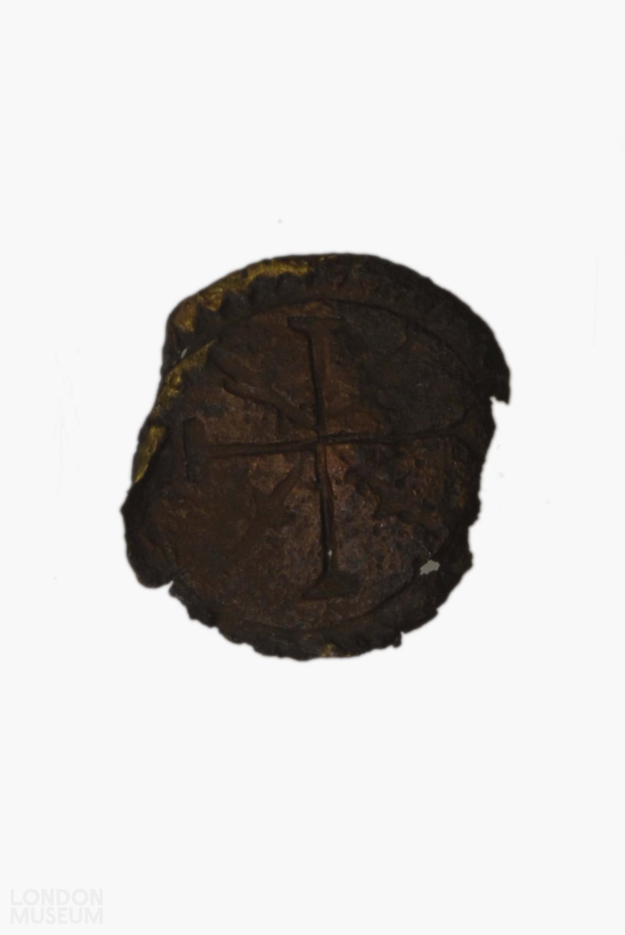 A copper alloy stud with inlaid decoration. There is a mainly coppery patina, golden at the edges. Four deeply-incised crossed arms with serifed terminals are interspersed with four fainter, stylized, foliate arms, which would have contained inlay. There is a circular-sectioned shank to the rear, lacking its point.