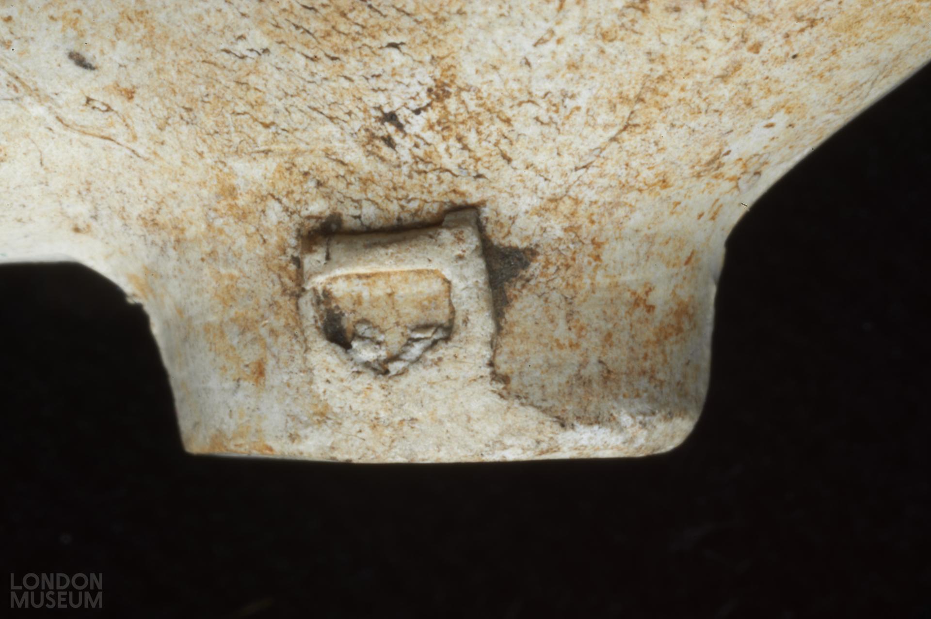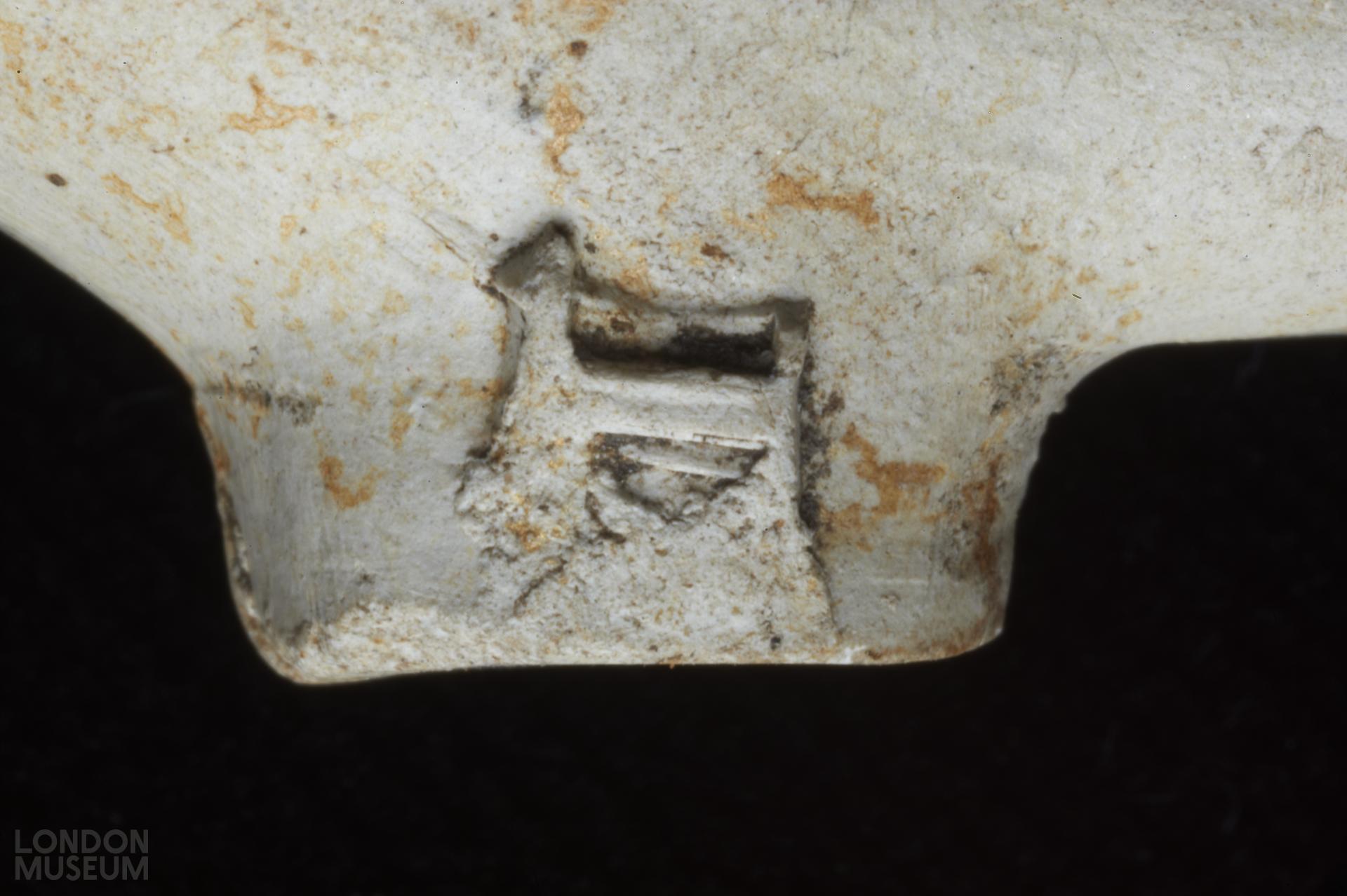 Complete bowl. Moulded marks on sides of heel, in relief: T (left side facing smoker) D (right side). Oswald (1975) type 11