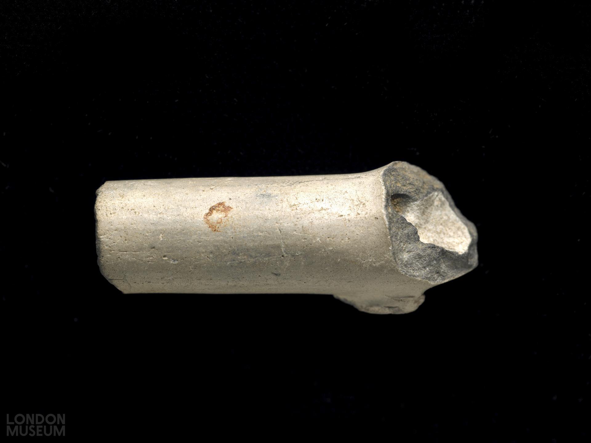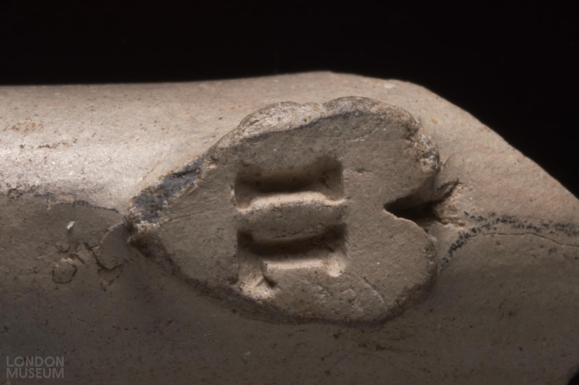 Bowl, incomplete. Good-quality burnishing over whole of surviving pipe. Stamped mark, incuse, on base of heel: IL. Atkinson and Oswald (1969) type 1/2